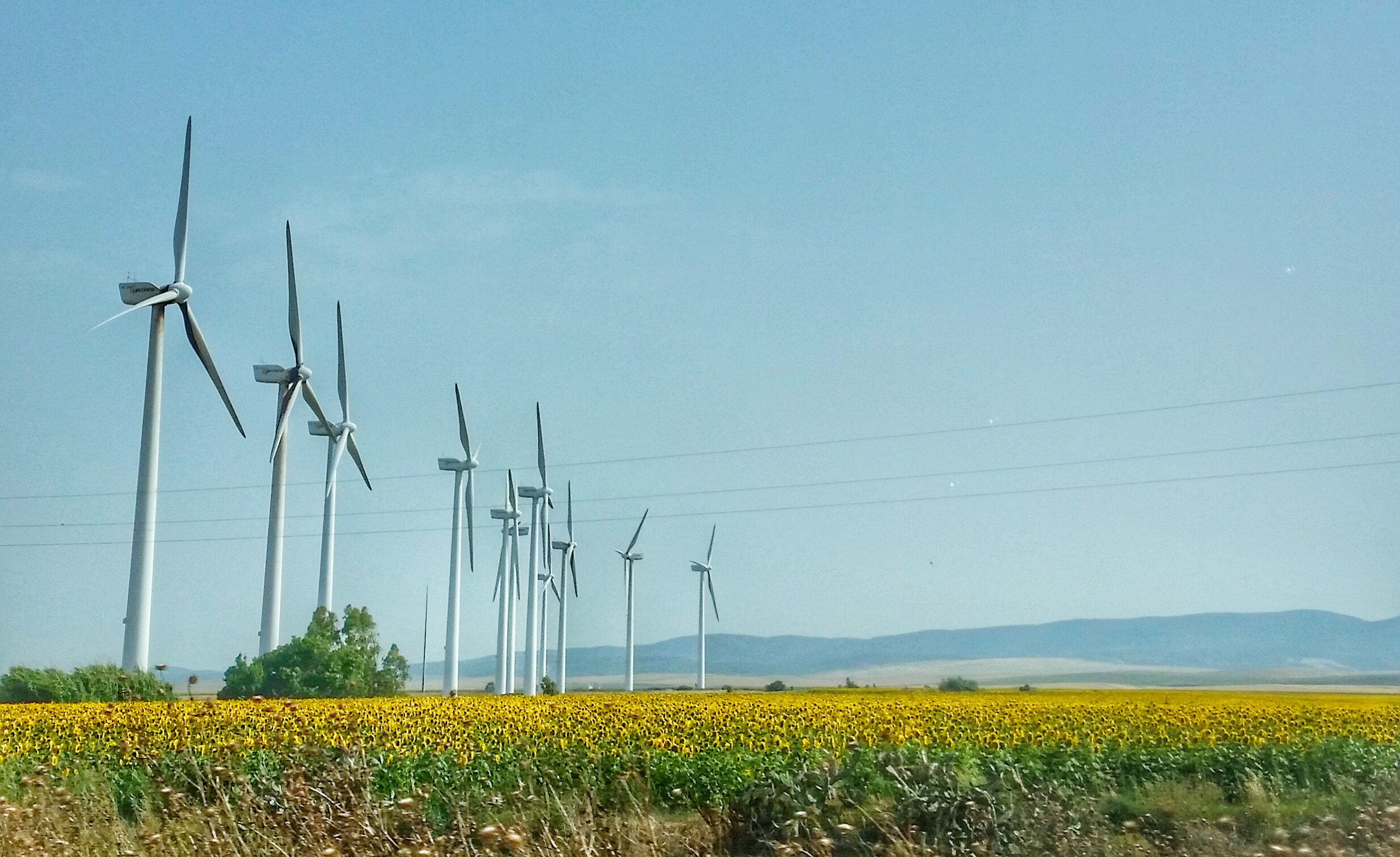 Il paesaggio tra Tarifa e Cadice: pascoli, campi di girasole, eserciti di pale eoliche: un territorio rurale ordinato e bucolico