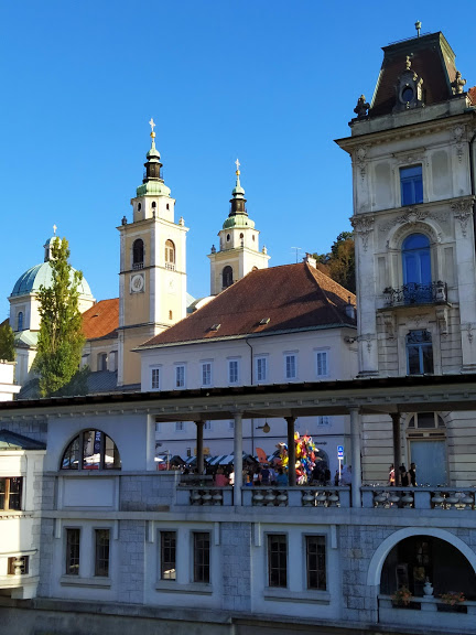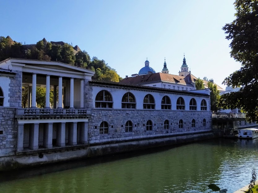 - gli edifici dei Mercati coperti sono una quinta scenografica impressionante lungo la Ljubljianica: sul lato del fiume essi richiamano edifici del Rinascimento italiano, mentre sul lato aperto verso la cattedrale sono un susseguirsi di colonne che richiamano architetture classiche. Tutto questo impressionante complesso architettonico era destinato ad ospitare le botteghe di macellai, panettieri e pescherie: niente di aulico, ma ciò che più contava nel quotidiano.