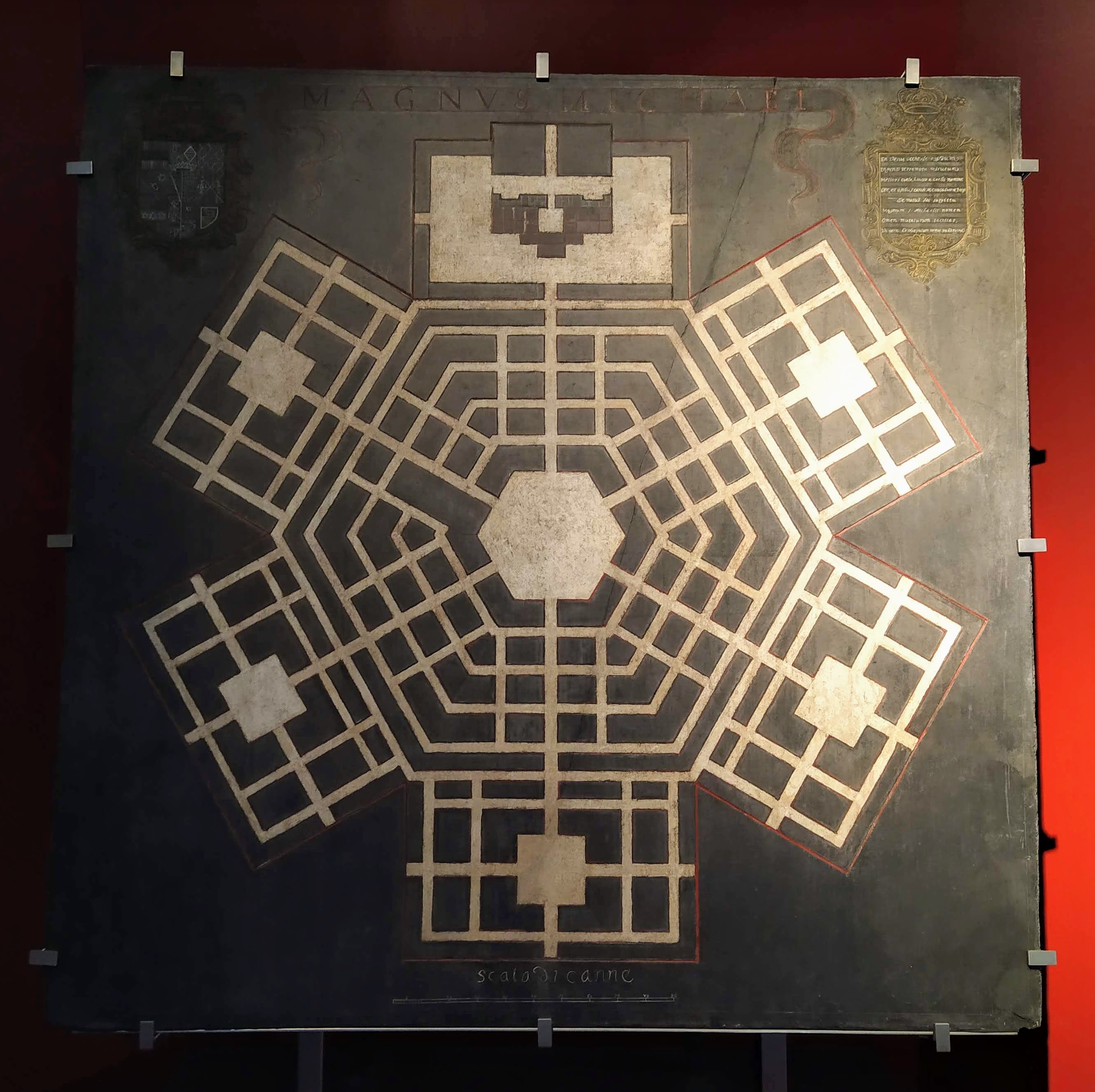 Il progetto che mise in atto fu senza dubbio un’operazione urbanistica senza precedenti: una città a pianta esagonale, poligono perfetto, che si diparte da un centro, la piazza esagonale su cui insistono municipio e cattedrale, e si dirama in sestieri che, accompagnati da vie regolari che disegnano esagoni sempre più ampi, si allarga fino ad uscire dalla città. Una città senza mura perché gli abitanti mai si dovranno sentire in trappola, una città con vie di fuga; ma una città che sembra, anche, un labirinto.
