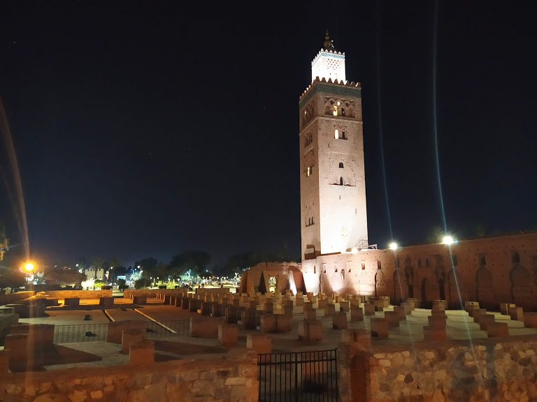 Dopo cena giro sulla piazza, piena di banchi di frutta e di gruppi di uomini raccolti intorno a raccontastorie (cui è bene che le donne non si avvicinino, vengo avvertita). Poi ci dirigiamo verso la Koutoubia, la moschea più importante di Marrakech. Il suo minareto è un vero e proprio punto di riferimento, ben visibile anche da kilometri di distanza. La sua torre così caratteristica ricorda la Giralda di Siviglia, e non è un caso, visto che entrambe furono costruite sotto la dinastia Almohadi quando essa governava anche la Spagna.