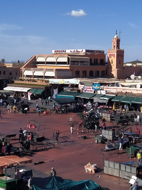 Quando usciamo in Place Jemaa el-Fna si ripropone la scena degli incantatori di serpenti che si avvicinano. Forti della nostra esperienza di ieri preavvisiamo i nostri compagni di viaggio evitando spiacevoli situazioni. Entriamo tutti quanto in un ristorante sulla piazza e andiamo in terrazza. Da qui per la prima volta mi rendo conto di quanto Place Jemaa el-Fna sia grande e brulicante di vita. Il suono ossessivo dei pifferi degli incantatori di serpenti e dei tamburi si placa solo quando il muezzin chiama alla preghiera, poi riprende come se non si fosse mai interrotto.