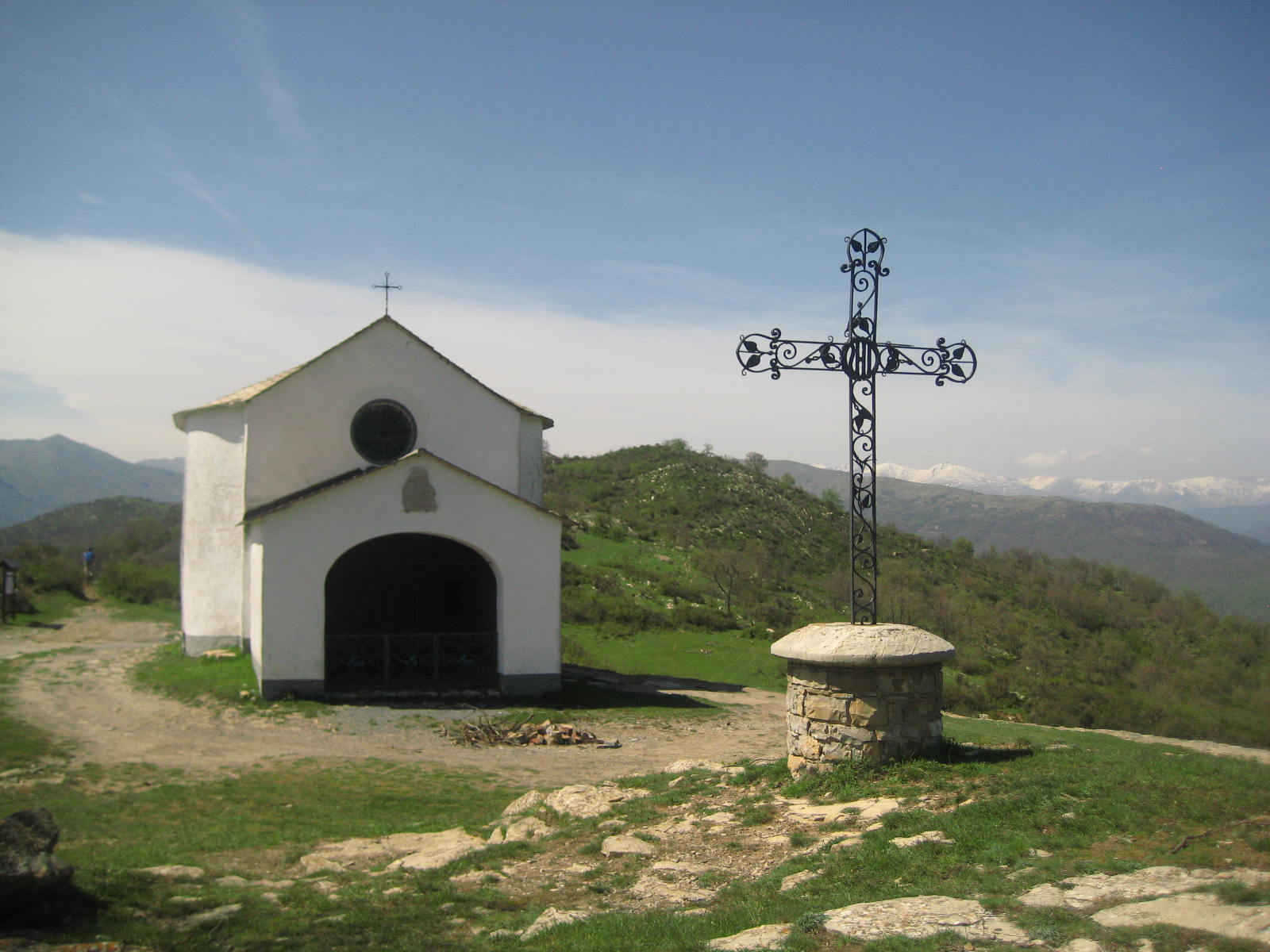 Giunti sul crinale, la cosa meravigliosa di cui ci si rende conto è che da qui si vede benissimo il mare, che pure è distante alcune decine di km! Una piccola cappella di valico, la chiesa del SS. Nome di Maria, ci indica che siamo lungo la Strada Marenca, la via della transumanza lungo la quale ogni anno si spostano da e verso il mare le mandrie di mucche. Questa cappella ha il classico aspetto delle cappelle e piccole chiese che sorgono qua e là isolate lungo antiche strade del Ponente: hanno un portico più o meno chiuso davanti all’ingresso, con tanto di panchina per consentire il riposo del pastore di passaggio e il ricovero in caso di pioggia. Questa cappellina, tutta bianca, ha sulle pareti una meridiana per indicare l’ora del giorno al pastore. Nulla è mai fatto per caso.