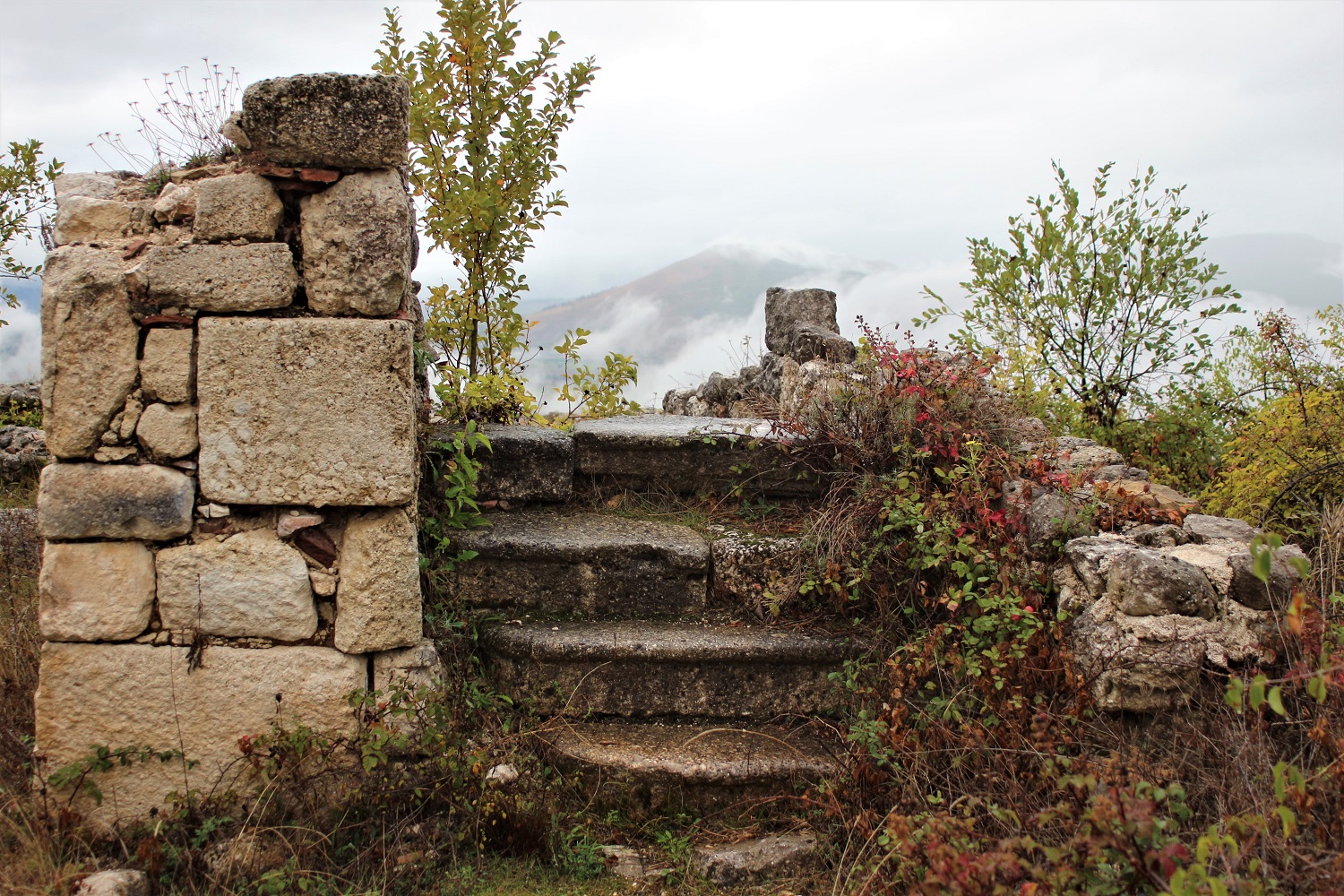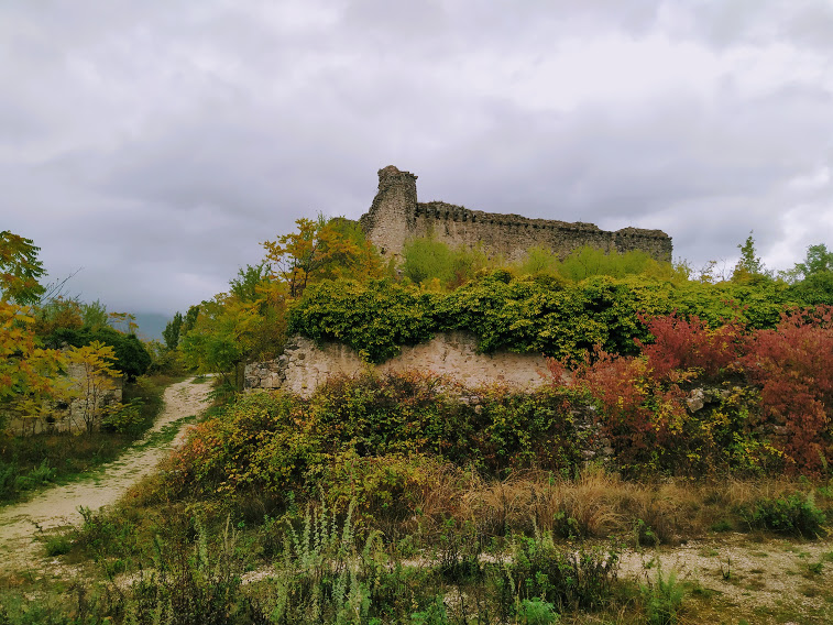 Il borgo medievale, piccolissimo, che sorge ai piedi del castello è stato abbandonato dopo il terremoto del 1915. Oggi, dopo un grosso intervento di restauro castello e borgo sono stati restituiti alla fruizione. Sarà stata la giornata autunnale in cui ci sono capitata io, ma la visita è davvero suggestiva, tra muri di pietra scuri, arbusti di rosa selvatica carichi di bacche rosse, foliage all’intorno e banchi di nebbia che vanno e vengono, ora nascondendo alla vista, ora rivelando particolari magnifici.