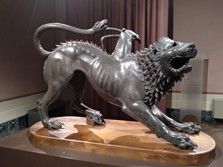 La Chimera è un capolavoro indiscusso: un mostro mitologico con corpo e testa di leone, una testa sul dorso a forma di capra e la coda che termina con la testa di un serpente; fa impressione perché è a grandezza naturale e la sua bocca spalancata con le fauci aperte è una visione terrificante. Trovata ad Arezzo nel 1553 fu immediatamente portata a Palazzo Vecchio e acquisita nella collezione di antichità della famiglia Medici. Poi fu esposta agli Uffizi fino a che non fu istituito il Museo Archeologico. Da allora la Chimera vive al Palazzo della Crocetta (sede del museo). Una particolarità relativa ad un suo restauro nel XVIII secolo la rende davvero unica: la Chimera non fu rinvenuta intera: mancava infatti la coda a testa di serpente, che le fu attaccata due secoli dopo circa nel corso del restauro; il restauratore decise di giocare con la coda facendo sì che la bocca del serpente mordesse uno dei corni della testa di capra del dorso, ormai morente. Questa è però una pura invenzione, perché nell’iconografia nota della Chimera, che il restauratore senz’altro conosceva, la testa di serpente si rivolge contro l’assalitore (nel mito Bellerofonte).