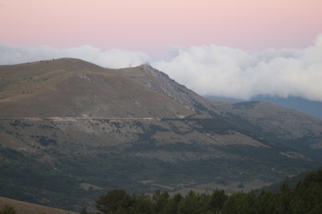 Riuscite a distinguere Rocca Calascio sull’altura là in fondo immersa nel tramonto rosa?