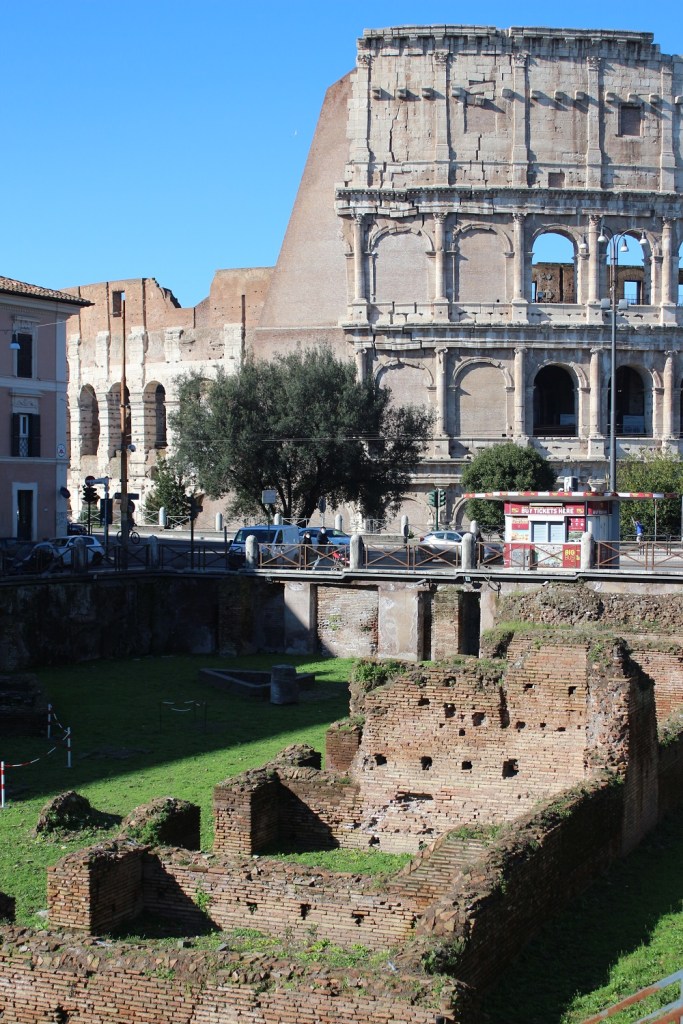 La linea del tram piega salendo verso le domus del Pincio. Da qui la vista si apre maestosa sul Colosseo. Magnifico, il grande Anfiteatro Flavio non può lasciare mai indifferenti, neanche se ci si passa davanti tutti i giorni per tutta la vita. Magnifico, ecco cos’è. E chissà come doveva essere appena inaugurato, nell’80 d.C. Il Colosseo di oggi infatti è stato in parte spoliato. Tuttavia, la sua bellezza sta anche in questo: nell’essere monumento di tutte le rovine. Io lo trovo magnifico. E come me tantissimi in ogni tempo. Da sempre il Colosseo è stato un simbolo della città di Roma. Ci sono parecchi aneddoti legati a questo straordinario edificio: ve ne vendo giusto due: