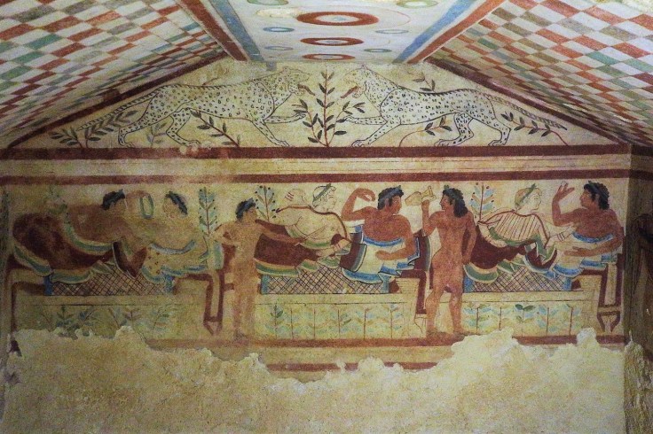 La vera attrazione di Tarquinia sono infatti le tombe etrusche della Necropoli dei Monterozzi: tombe a camera scavate nella roccia, alle quali si arriva dopo aver percorso corridoi ripidi che scendono nel ventre della terra. Le scene dipinte rimandano spesso al mondo del banchetto aristocratico, al quale partecipano uomini e donne sdraiati sui letti, mentre danzatrici e schiavi che suonano il doppio flauto animano la festa. Scene che appartengono a un mondo lontano, ma che sono più vivide che mai nei loro colori e negli occhi accesi dei personaggi.