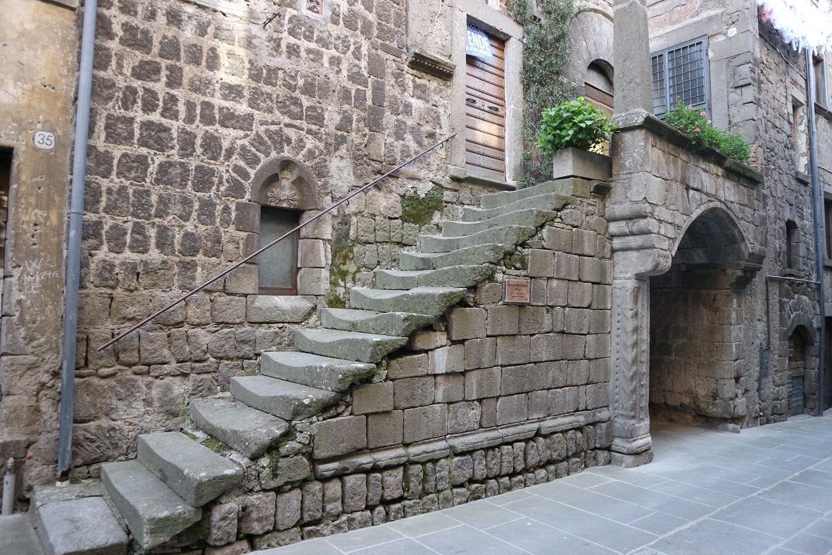 Altro edificio interessante è la “Casa del Vescovo”, sempre del XIII secolo e caratterizzata da una bella scala esterna, che si chiama profferlo, sotto la quale si trova un bel portale decorato, sempre in peperino, la pietra locale. I profferli sono un elemento architettonico tipico degli edifici medievali di Vitorchiano: la scala, sostenuta da un arco a sesto ribassato, conduce ad un terrazzino dal quale si entra poi nell’edificio. Il nome Casa del Vescovo deriva dal fatto che qui alloggiava il vescovo di Civita di Bagnoregio, della cui diocesi Vitorchiano faceva parte, durante le sue visite pastorali.