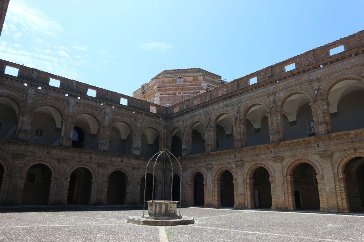 Caprarola è il borgo in cima al quale si trova lo straordinario Palazzo Farnese. Un edificio a pianta pentagonale all’esterno, con un cortile centrale circolare, le cui sale sono via via affrescate con tematiche e simbologie legate alla famiglia Farnese, ma anche alla mitologia greca – letta sempre in un’ottica di celebrazione della nobile famiglia romana. La facciata del palazzo chiude prospetticamente la lunga strada dritta che attraversa il borgo. Il Palazzo sorge su una terrazza artificiale e si giunge all’ingresso superando una scala. Alcune stampe antiche mostrano che sul piazzale si svolgevano anche giostre a cavallo: forse esagerato, ma rende l’idea degli spazi.