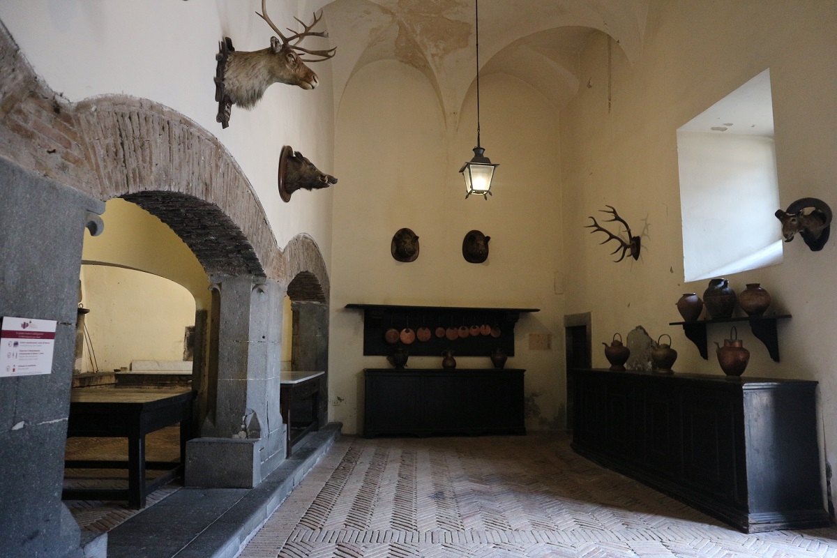 Ad accoglierci subito all’interno del castello è un orso che regge uno stemma: è il simbolo della famiglia Orsini, che vantava origini mitologiche: un certo Ursus che sulle rive del Danubio era stato allattato da un’orsa, così come Romolo e Remo con la Lupa. Palese, dunque, la volontà di legittimare la potenza della famiglia facendola discendere da origini mitologiche. Dall’ingresso si accede all’antica armeria, oggi spoglia, poi si sale alle cucine, arredate oggi come allora, con i camini, le tavole, il vasellame da mensa e da cucina. Sembra ancora di sentire il calore del fuoco, lo sfrigolare delle vivande sopra la fiamma. Non so perché, ma a me le cucine antiche fanno un grande effetto.