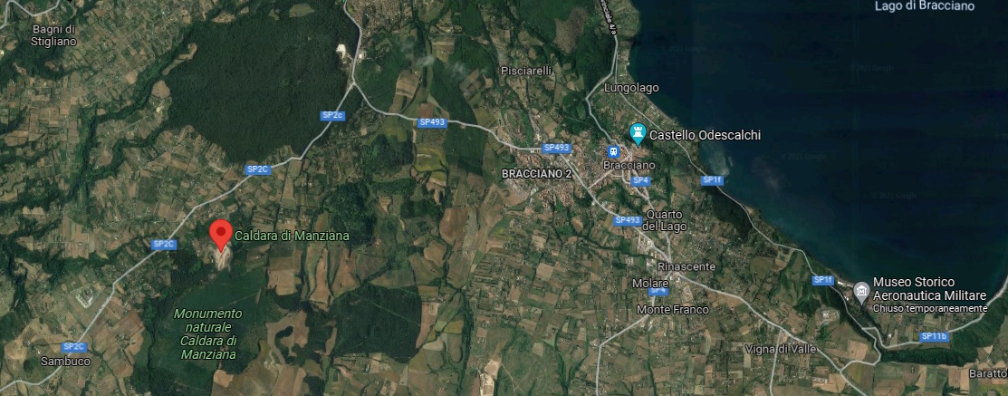 La Caldara di Manziana in rapporto col lago di Bracciano. Fonte Google Maps