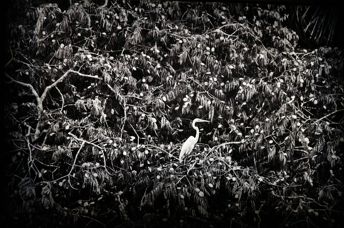 • L’elegante silhouette di un airone bianco si staglia nella foresta di igapò sulla quale è appollaiato. Un’immagine che dona una calma assoluta, eppure, conoscendo questi uccelli, sappiamo quanto siano veloci a librarsi in volo da un momento all’altro. Questa è un’immagine di calma apparente, così come in uno stato di calma apparente si vive nella foresta.