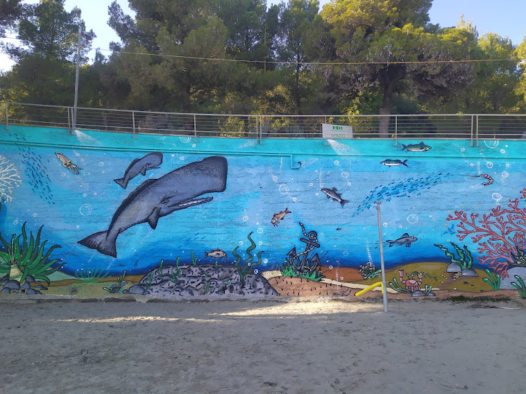 Percorrendo questa passeggiata panoramica, ombreggiata dai pini e vivacizzata dagli aloe in fiore, l’attenzione è colta da un muraglione che arriva in spiaggia completamente dipinto. Un murales bellissimo, che racconta la vita sottomarina ligure, con la sua fauna tipica, tra cui granchi, cavallucci marini, pesce azzurro, calamari e poi lui, uno dei frequentatori del Santuario dei Cetacei che si trova al centro del Mar Ligure: il capodoglio. Il tutto in un’ambientazione vivacissima, coloratissima, allegra, come allegro dev’essere stare “in fondo al mar“.