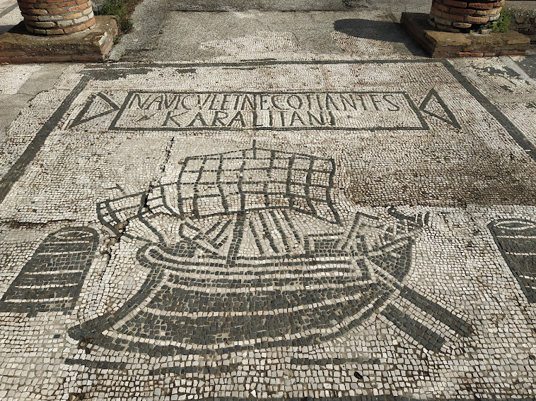 La particolarità del Piazzale delle Corporazioni, e il motivo per cui sappiamo cosa vi succedeva, sta iscritto e raffigurato sui pavimenti delle singole sedi di corporazione: di volta in volta una nave entra in porto, una nave solca i mari, un delfino nuota nel mare, un saccarius (scaricatore di porto) trasborda un’anfora da una nave all’altra, un elefante fa bella mostra di sé. Ognuno di questi mosaici funzionava come un’insegna in grado di orientare l’acquirente o l’affarista verso la sede giusta. Le iscrizioni a mosaico sui pavimenti rivelano poi anche la provenienza dei naviculares o dei negotiantes (armatori o mercanti): ne abbiamo da Narbonne (Francia), Tarraco e Gades (Tarragona e Cadige, Francia), Carthago, Sabratha e altri porti dell’Africa settentrionale, Karalis e Turris Libisonis (Cagliari e Porto Torres) in Sardegna. Una mappa del Mediterraneo molto ben delineata, non c’è dubbio.