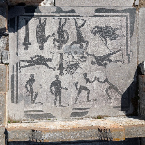 Le Terme di Porta Marina sono famose per il bellissimo mosaico degli atleti: posto in un vano di passaggio verso la palestra, illustra a tessere bianche e nere diversi atleti che gareggiano: ci sono i pugili alla presenza del giudice, l’atleta di salto in lungo, l’atleta che si deterge con lo strigile per pulire la pelle al termine della gara… Nel centro del mosaico si trova una tavola sulla quale si trovano i premi per i vincitori, mentre ai piedi del tavolo si trovano strigili e un pallone: eh sì una palla di cuoio, perché il gioco del calcio è davvero, davvero, antico.