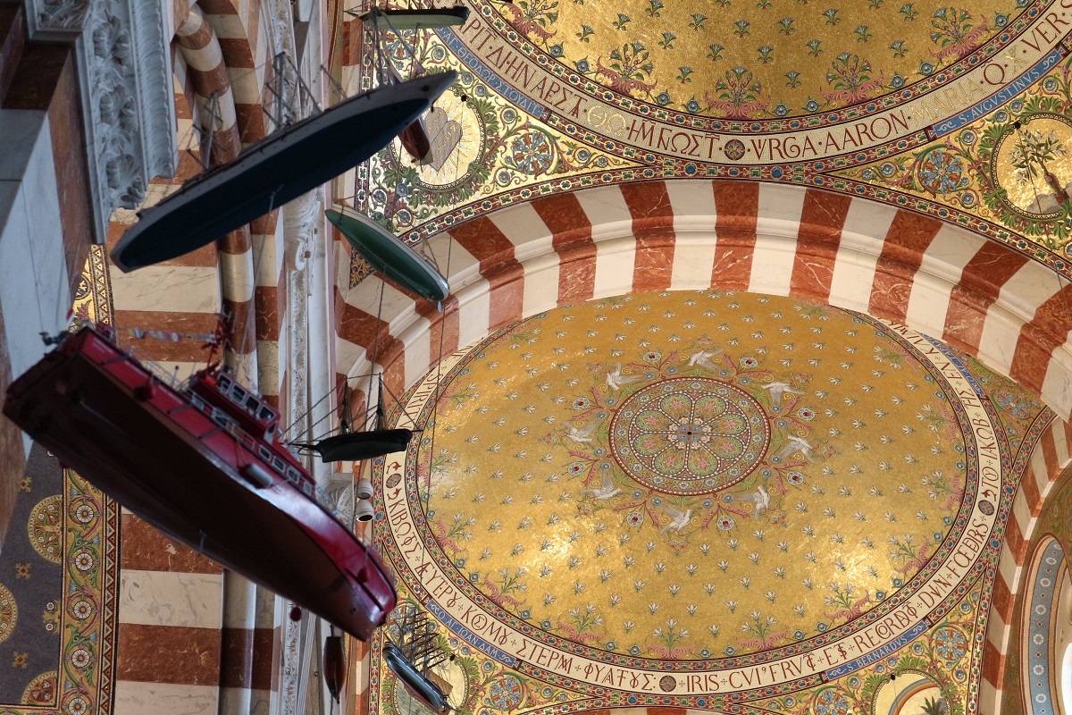 La costruzione della Basilica di Nôtre-Dame-de-la-Garde è piuttosto recente: risale alla metà del XIX secolo e da subito è stata scelta quale luogo ideale per accogliere gli ex-voto, numerosissimi, dei marsigliesi le cui attività prevalenti erano (e sono) legate al mare, ai commerci, ai viaggi. La basilica, magnifica nei suoi mosaici dorati che riflettono al sole che entra dalle finestre, è ricchissima di ex-voto: dipinti che raffigurano barche e aerei, ma soprattutto modellini di barche e di navi (e di aeromobili) che sono appesi e pendono dal soffitto. Impressionante e unico nel suo genere. Personalmente mi ha molto emozionato, non sapevo che gli ex-voto potessero assumere anche questa forma.