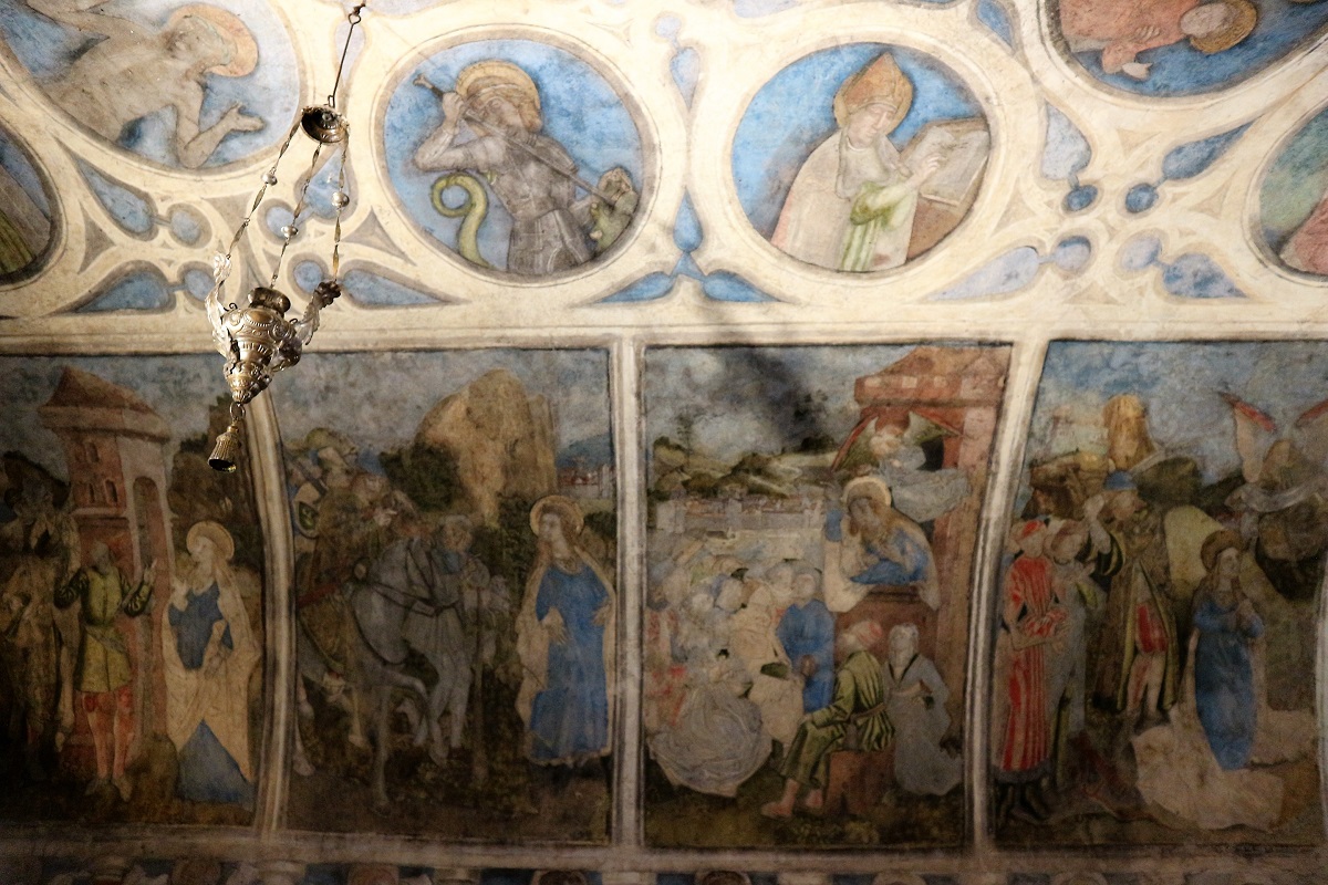 La cappella è affrescata su ogni parete e sul soffitto con storie di santi, della crocifissione e del martirio di Santa Barbara. Gli affreschi risalgono all’inizio del XVI secolo e conservano ancora vividi colori ed espressioni dei personaggi. Da trascorrere un’ora solo qui dentro a indovinare i dettagli e a perdersi in essi.