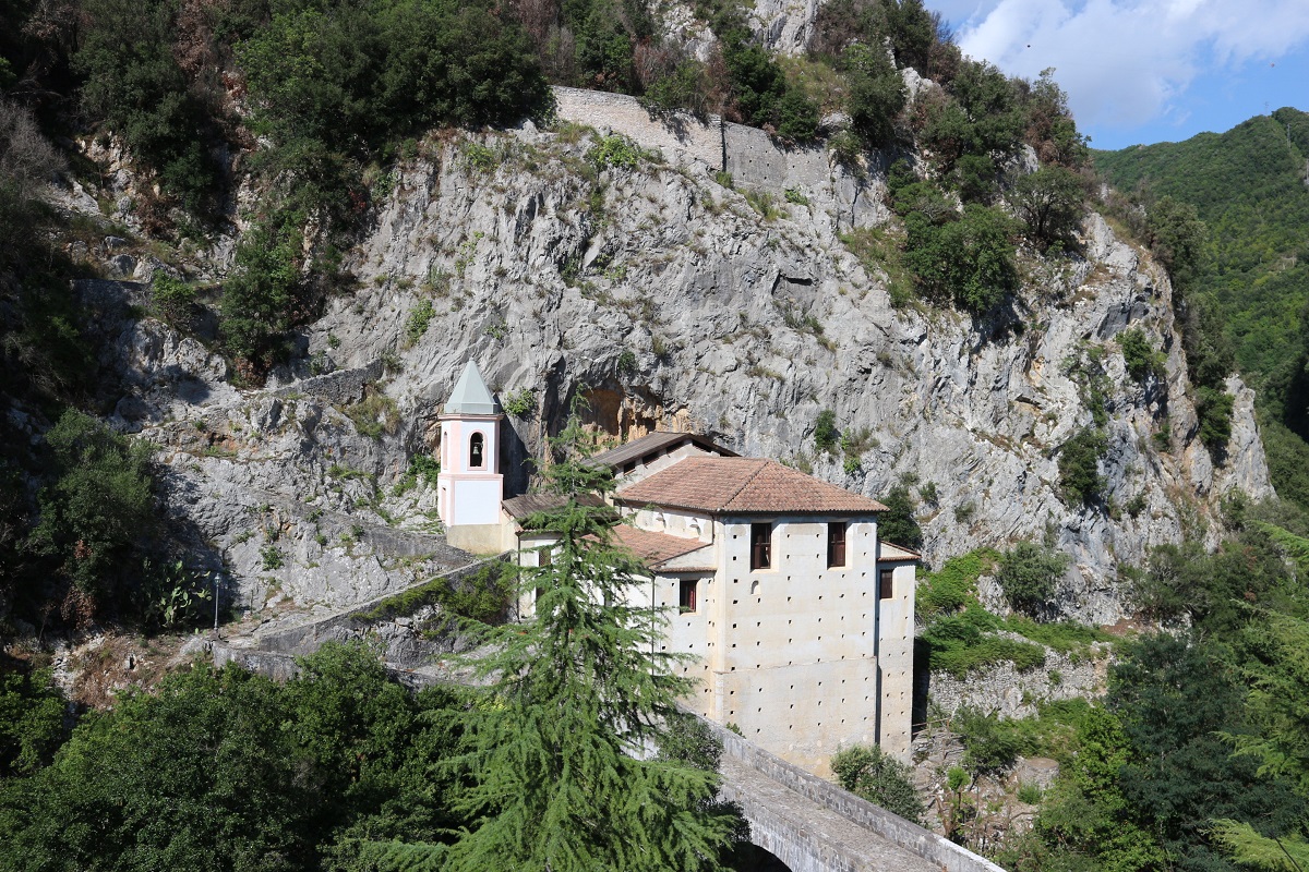 Lasciamo la grotta paleolitica e raggiungiamo, dopo diverse curve e paesaggi mozzafiato sulle verdi montagne del Pollino, il borgo di Papasidero. Un borgo antico, molto curato, in salita ma non troppo. Viuzze strette (vinelle, le chiamano in Calabria) e la via più larga che conduce al ponte sul fiume Lao. Oltre il ponte ecco lì il Santuario di Santa Maria di Costantinopoli, la cui particolarità è quella di essere costruito interamente contro la parete rocciosa della montagna scoscesa. Il ponte per raggiungere la chiesa è stato ricostruito nel 1904, ma al di sotto dell’arcata si intuisce l’arco del ponte ben più antico, medievale, detto della Rognosa: perché si chiama così? Perché il Santuario di Santa Maria di Costantinopoli durante l’epidemia di peste del Seicento divenne lazzaretto per i malati.