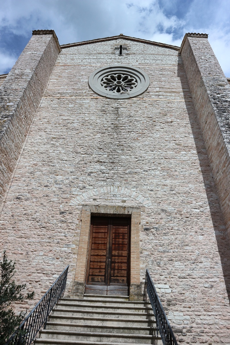 La Collegiata di San Pietro risale anch’essa al XIV secolo, ma in realtà si installa su un edificio preesistente, tanto da essere menzionata in un documento del 1191. Non è una chiesa molto fortunata, ha subito diversi crolli nel corso dei secoli, l’ultimo dei quali col terremoto del 1997. Alla chiesa si accede lateralmente e la facciata rimane nascosta alla vista, rivolta verso l’esterno del borgo. Quando la si raggiunge si rimane a bocca aperta. Non affaccia su una piazza e forse è per questo che sembra ancora più alta di quanto non sia in realtà. Una facciata alta e stretta, in pietra bianca, davvero molto sobria.