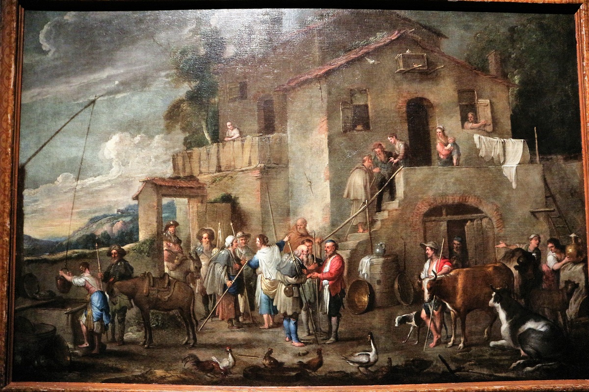 Un altro pozzo a bilanciere, già che siamo in tema, compare nella tela di un altro fiammingo, Cornelis De Wael dal titolo “Alloggiare i pellegrini“: essa appartiene a quelle scene di genere tanto care al gusto barocco fiammingo e che a Genova trovano terreno fertile in una committenza ricca di una città prosperosa, ma allo stesso tempo popolosa e dove, come al solito, gli indigenti sono tanti, troppi. Questi sono sostentati da lasciti e sostegni economici da parte delle grandi famiglie aristocratiche e per questo, forse, non si sono mai registrate rivolte popolari. Pare, così, che il proverbiale “braccino corto” dei Genovesi sia una leggenda tutta da rivedere.