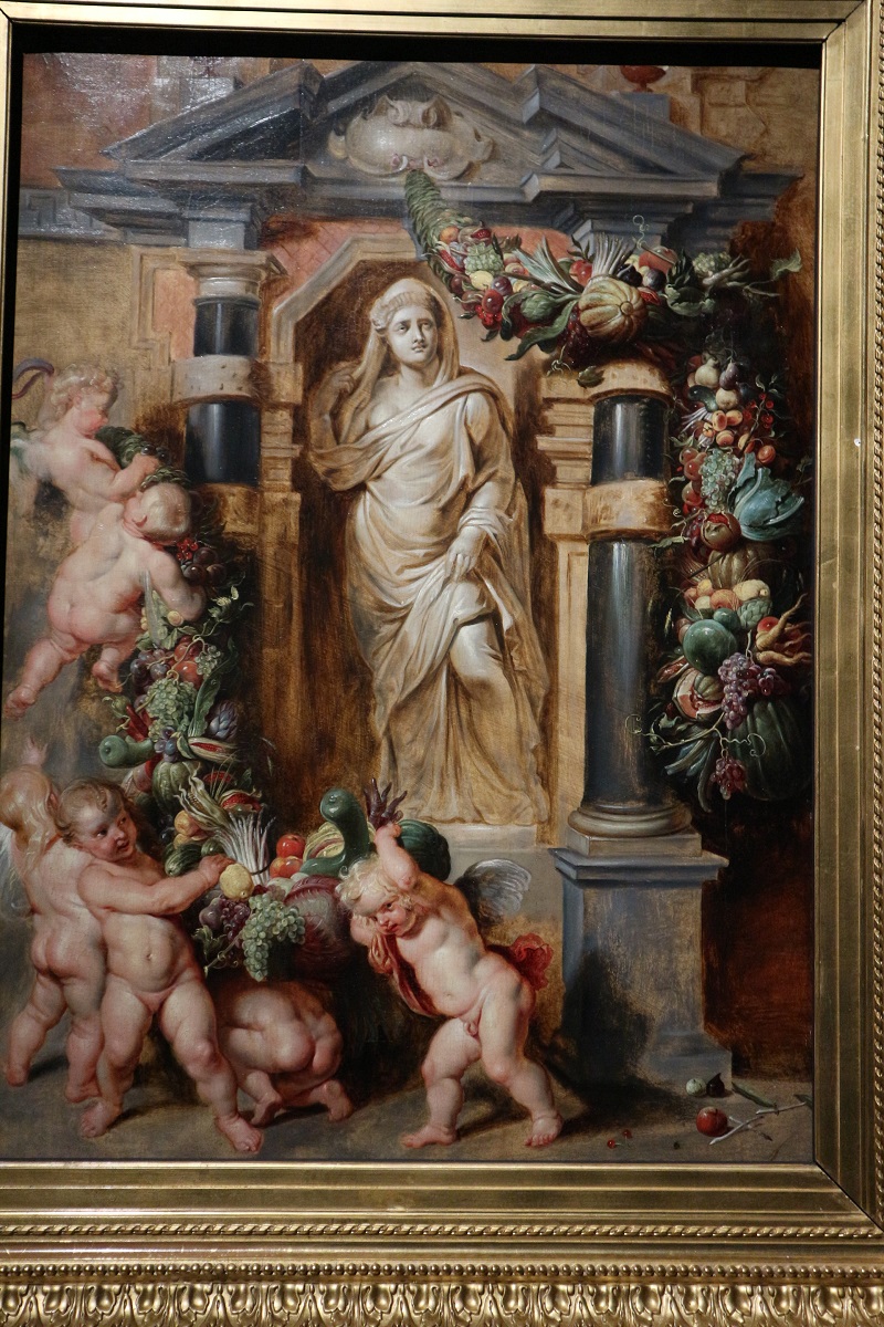 E se il ritratto è lo specchio del reale, c’è tutto un mondo immaginario da fissare su tela: Rubens e altri suoi colleghi coetanei sperimentano soggetti in cui si mescola la pittura di genere con la rappresentazione delle divinità classiche, quasi antesignane dell’Arcadia. Così l’ “Omaggio a Cerere” che Rubens dipinge tra il 1612 e il 1615 raffigura la dea in forma di statua, collocata all’interno di un’edicola votiva, ma circondata da frutti della terra che sono reali, non in marmo come lei, e i puttini, con le loro forme paffute e pasciute rimandano a un ulteriore piano stilistico. Questa tela è a tutti gli effetti una commistione eclettica di elementi che mai sarebbero stati insieme tra loro. Ma Rubens lo può fare.