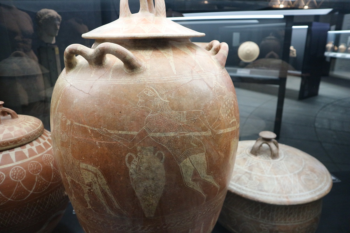 L’esposizione di terrecotte e di vasi dipinti prosegue la sua corsa cronologica e stilistica passando dalle produzioni etrusco-italiche e laziali alla ceramica corinzia di importazione ed etrusco-corinzia, riconoscibile nelle olpai (brocche), decorate con serie di animali più o meno fantastici in posa araldica, ovvero di profilo, incedenti verso destra o sinistra, con grazia ed eleganza. Anche la cultura etrusca è rappresentata, sia attraverso vasi di produzione etrusca che attraverso vasi di importazione attica, cioè dalla Grecia, da Atene. E poi arriviamo in Puglia, ovvero in area apula, Taranto, ma anche Egnazia, e nel rimanere folgorati davanti a vasi funerari o piatti enormi e decoratissimi, non possiamo far altro che pensare che di queste opere non sappiamo niente di più rispetto a ciò che vediamo. E ci viene il dubbio, anche qui, che possano essere falsi. Questa consapevolezza, nuovamente, è un peccato, perché è un’occasione persa di nuova conoscenza del nostro passato.