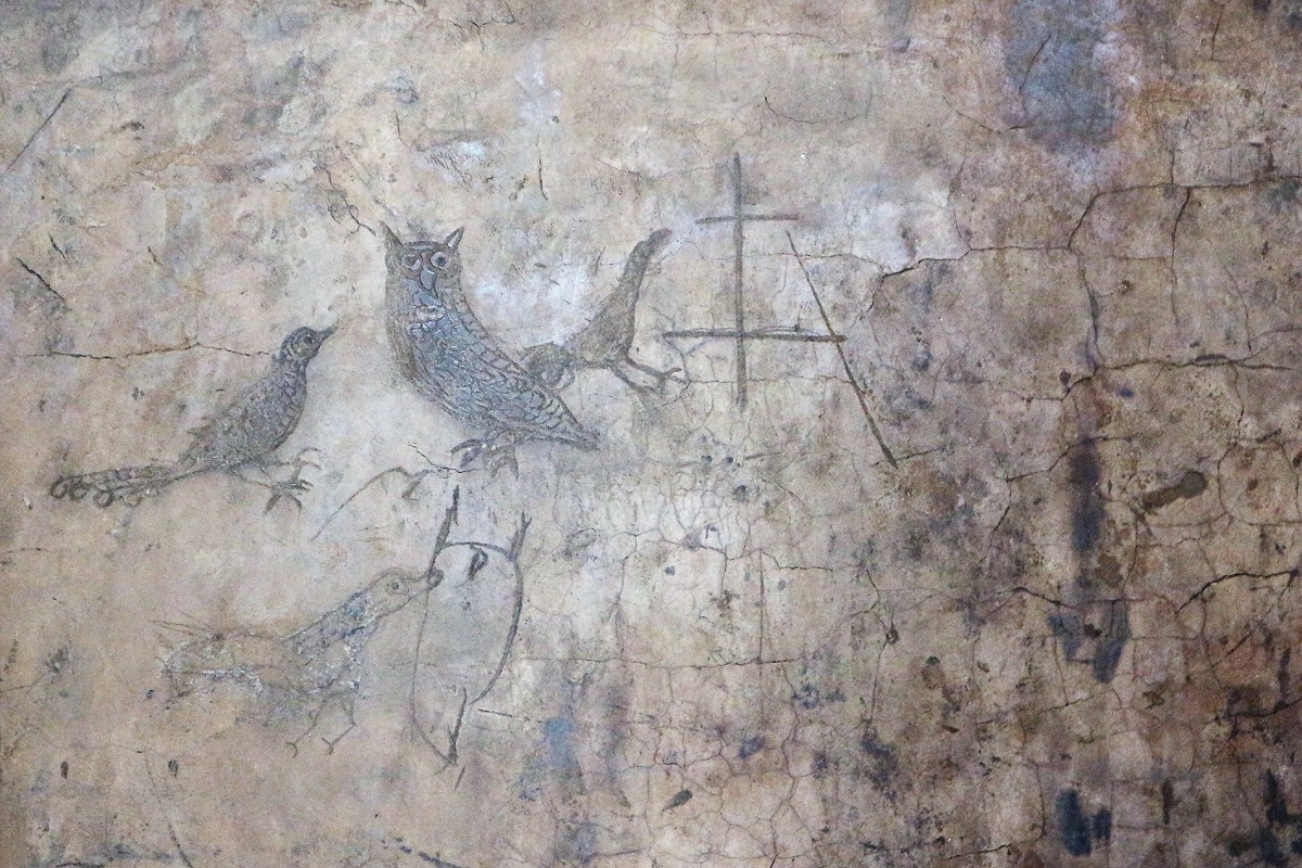 Se stacchi gli occhi dal soffitto della Sala degli Elementi e guardi il caminetto della stanza noterai una cosa abbastanza buffa: sul muro di fondo (il caminetto è stato murato a un certo punto della sua storia, e ha smesso di svolgere la sua funzione) sono incise diverse cose, tra figure e lettere e parole non sempre distinguibili. Graffiti storicizzati (cioè non scritti negli ultimi 40 anni) si trovano un po’ ovunque sulle pareti di Palazzo Vecchio (anche sull’affresco col cane di cui sopra), ma qui non abbiamo semplicemente un graffito, abbiamo una vera e propria raffigurazione: due uccelli, di cui uno è chiaramente un gufo, mentre l’altra, a giudicare dalla coda, potrebbe essere una gazza. Si trovano poi altri uccelli graffiti, venuti piuttosto male. Non so quale sia il significato del gufo e della (presunta) gazza, né so chi li abbia graffiti e quando su questo caminetto. Tuttavia è un dettaglio che mi ha fatto voltare lo sguardo, mi ha incuriosito, e perciò ve lo racconto.