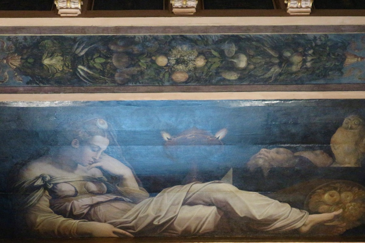 Tra i vari soggetti rappresentati (ci sarebbero da scrivere pagine per ciascuno) ce n’è uno che attira la mia attenzione: la Notte. Un momento, io l’ho già vista “questa” Notte. Certo che l’ho già vista: è la trasposizione in pittura di una scultura tra le più famose di Michelangelo: quella della Notte realizzata per la tomba di Giuliano de’ Medici nelle Cappelle Medicee. Ora, rispetto alla scultura, la Notte qui raffigurata è vestita innanzitutto, e più sdraiata. Tuttavia la posa è molto simile, così come la distanza tra i seni e il volto poggiato sulla mano, segno di una persona che si addormenta in attesa di qualcosa. La citazione col modello michelangiolesco per me è molto stringente.