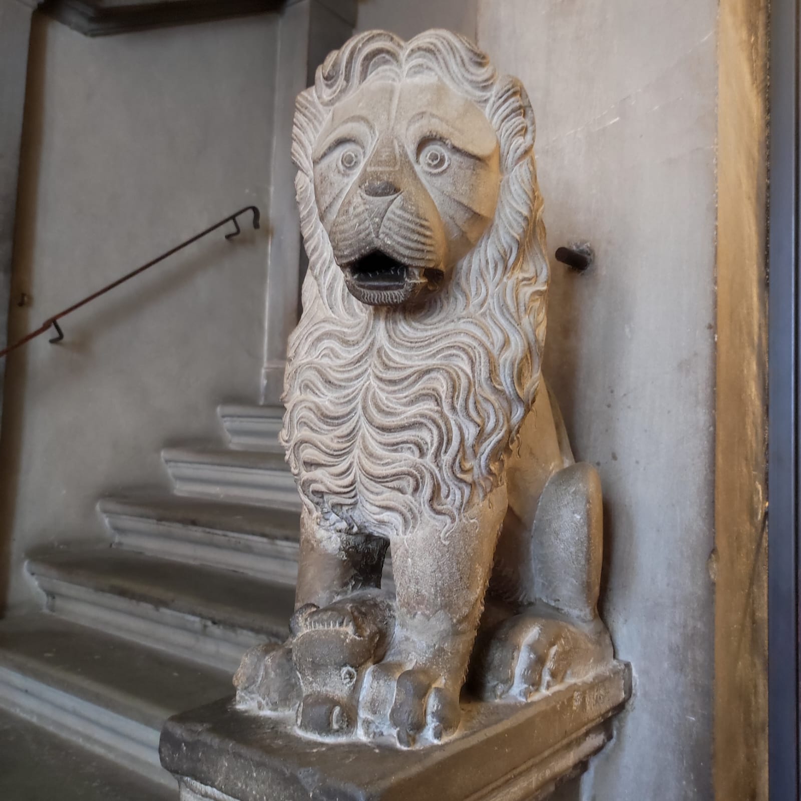 Il Marzocco non è l’unica statua in pietra raffigurante un leone di Firenze. Basta guardare l’accesso della Loggia dell’Orcagna, su Piazza della Signoria, per vedere che è fiancheggiata da due leoni, uno di età romana e l’altro realizzato in età rinascimentale sulla falsa riga del leone romano. Anche nel cortile interno di Palazzo Vecchio vi sono leoni di pietra, dall’espressione piuttosto minacciosa. Il leoncino che si trova a conclusione del percorso di visita di Palazzo Vecchio, laddove inizia la stretta scalinata che porta su alla Torre di Arnolfo, è piccolino e con i suoi grandi occhioni non può che fare simpatia. Non esattamente espressione di ferocia e potenza, ecco.