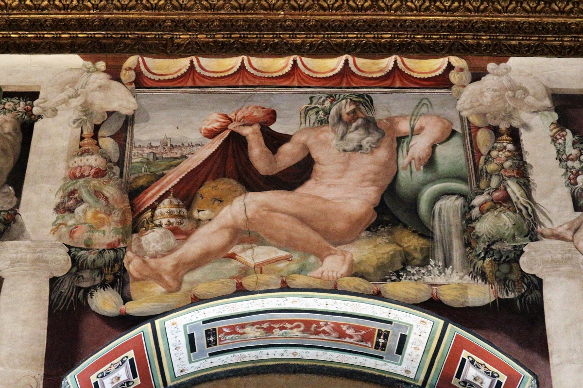 Nell’iconografia, dall’antichità al Rinascimento e fors’anche al Barocco, la personificazione dei fiumi è così fatta: un uomo anziano, con lunga barba e folti capelli, semisdraiato con accanto gli attributi propri della terra in cui scorre: per il Nilo ad esempio i Romani utilizzavano il grano, per il Tevere la cornucopia simbolo di prosperità; e per l’Arno? A Palazzo Vecchio incontriamo la personificazione dell’Arno nella Sala delle Udienze. E l’iconografia corrisponde: un signore anziano, semidisteso, nudo, con barba e capelli grigi, e un bel copricapo verde di alghe o foglie palustri. Il Fiume di Firenze si appoggia a una giara da cui fuoriesce acqua corrente, e tiene sollevato un drappo sotto il quale stanno i simboli di Firenze: il leone, che ricorda il Marzocco, i simboli del papato (ricordiamo che Leone X appartiene alla famiglia Medici), mentre alle spalle, sullo sfondo, sorge la città di Firenze.