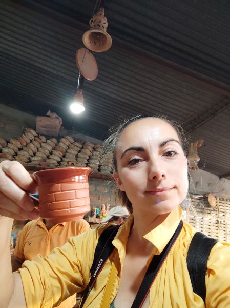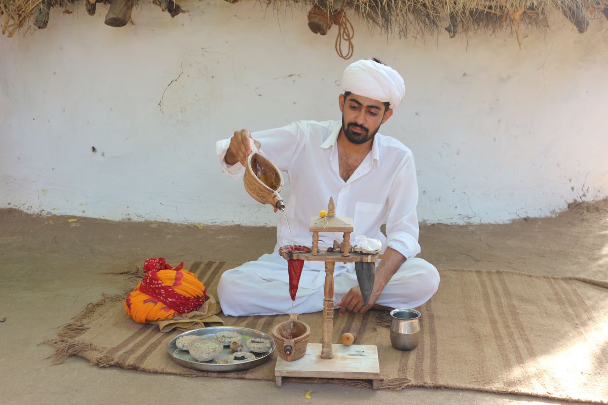 Oggi la comunità Bishnoi si è completamente svenduta al turismo. O almeno così pare. Lo dico con un certo dispiacere, perché davvero l’idea di una comunità ambientalista pura ai margini di una metropoli indiana sarebbe molto interessante. Il problema è che quell’idea si è prostituita in nome del turismo occidentale. La visita al villaggio Bishnoi si riduce a una dimostrazione di offerta di oppio a Bhrama da parte di un palese attore che si esibisce poi nella composizione del turbante più grande dell’India. Decisamente triste. Il “safari” continua su strada asfaltata prima presso la bottega di un tappezziere, cioè di un tessitore di tappeti, i tradizionali dhurrie: esperienza che sarebbe anche interessante, ma che non godiamo minimamente per la sete che abbiamo e per l’acqua che inevitabilmente manca. Va meglio alla terza tappa nelle terre Bishnoi: dopo una tappa a un rivenditore di acqua – che ci rimette al mondo – eccoci sotto la tenda del ceramista che lavora l’argilla al tornio creando forme ceramiche aperte e chiuse. E sì, qui mi faccio prendere dall’entusiasmo e acquisto una piccola tazza per il chai.