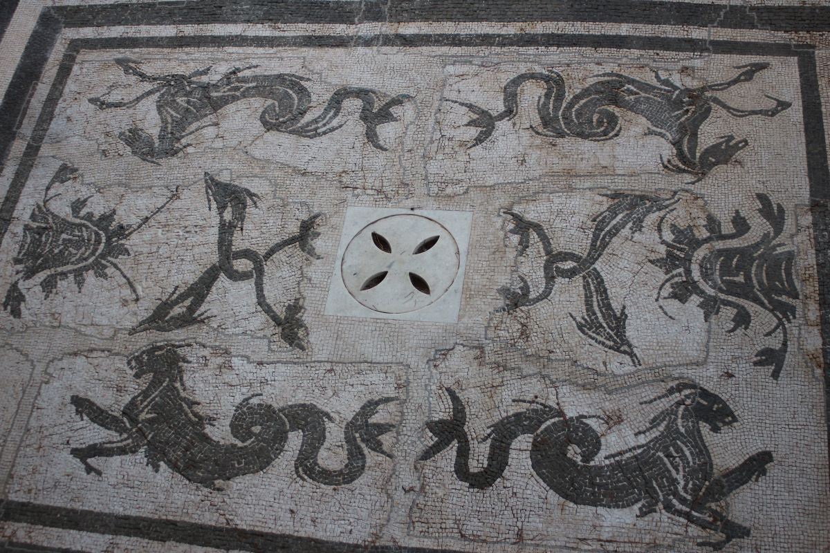 In particolare nell’area archeologica a valle, si conserva un pavimento a mosaico a soggetto marino, venuto in luce all’interno di un edificio che è stato ribattezzato “Edificio con mosaico”, e che doveva riferirsi a un piccolo impianto termale, probabilmente a uso e consumo dei viaggiatori. Qui è anche sistemata una piccola parte a museo, con esposti alcuni reperti provenienti dagli scavi, tra cui un frammento di conduttura dell’acqua in piombo (in latino fistula) con l’iscrizione che riporta il nome dei proprietari della villa, i Venulei.