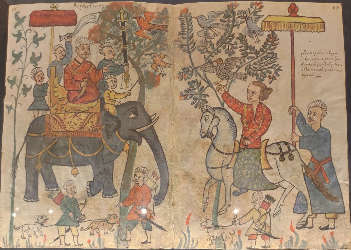 E poi c’è il protagonista indiscusso dell’esposizione: il Codex Casanatense. Solo alcune tavole in realtà, ma mi piacerebbe davvero visionarle tutte, perché sono meravigliose. Di che si tratta è presto detto: a metà del Cinquecento, intorno al 1540, un medico e botanico portoghese, Garcia de Orta, in missione in Asia e India, scrive un’opera, che intitola “Colloquios” (Colloqui) in cui racconta varie vicende di cui è stato testimone nel corso del suo viaggio. Si trova a Goa quando decide di affidare a un artista locale, indiano, che resterà anonimo per sempre, ma che ci ha lasciato delle tavole bellissime, gli episodi e le scene per lui più significative del suo racconto. 76 tavole realizza il nostro ignoto autore, in uno stile riconoscibilissimo come indiano, con colori vividi, scenari che a me hanno ricordato molto – seppur realizzati secoli dopo – gli affreschi di certi Haveli a Mandawa, in Rajasthan. Una scena che a me è piaciuta molto, e non di immediata comprensione, vede un Indiano in groppa a un elefante che affronta un uomo a cavallo in abiti e fattezze diverse: si tratta di una scena di guerra tra due popoli, non immediatamente riconoscibile come tale, quanto meno a un occhio inesperto quale il mio, ma che fa scopa con il testo dei Colloquios di Garcia de Orta, in cui si fa riferimento a una battaglia svoltasi negli anni intorno al 1540 nell’India del nord. Io, per parte mia, senza cogliere la drammaticità dell’episodio, ho colto piuttosto l’attenzione ai dettagli e all’ambiente, con quegli uccelli sugli alberi che parlano di una natura rigogliosa, altro che guerra.
