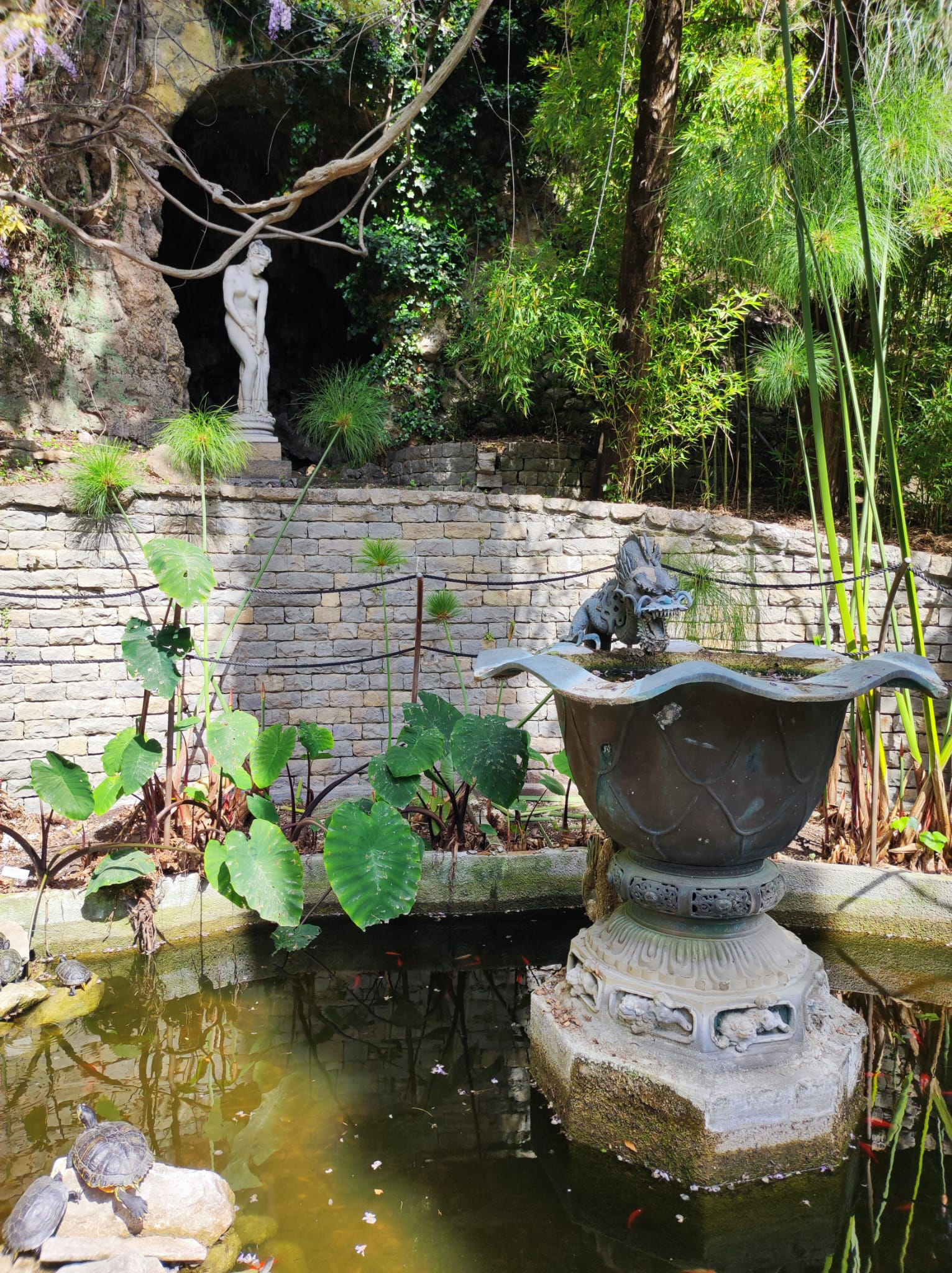 Come dicevo, il percorso è in discesa. Frecce rosse indicano il sentiero da percorrere, mentre frecce blu ci guideranno al ritorno per la risalita. Immersi tra le piante, ogni tanto si aprono scorci sulla Villa che sorge più in basso, di tanto in tanto è il golfo di Ventimiglia che fa capolino tra gli alberi sul limitare del Parco. E poi si incontrano vere e proprie attrazioni architettoniche: un tempietto rotondo, la “fontana del drago”, dominata dalla statua minacciosa di un drago giapponese, il mausoleo in stile moresco e infine la Villa, cuore pulsante del giardino, in posizione panoramica, perfettamente riconoscibile nel suo bel colore arancio-rosato e avvolta, in primavera, nell’esuberante fioritura del glicine. Il glicine in questa stagione in effetti la fa da padrone: avvolge pergolati che diventano straordinarie gallerie lilla, si arrampica lungo le balaustre di scaloni monumentali, si mescola alle rose gialle selvatiche per regalare straordinarie suggestioni per gli occhi.