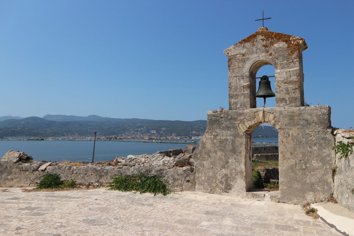 Superata la Porta del Leone si esce in una spianata ampia, tenuta a prato e arsa dal sole, chiusa dalle mura. Si può percorrere l’intera spianata, raggiungendo la piccola chiesa, salendo a una piccola porta ad arco con tanto di campanella, dalla quale si gode di una vista panoramica sul porticciolo moderno di Lefkada. Infine, si può trovare il giusto e meritato ristoro dal troppo caldo estivo nel piccolissimo museo ricavato in un ambiente voltato, rinfrescato da un’aria condizionata forse troppo forte, ma graditissima. Qui si racconta la storia del forte con una serie di pannelli e qualche reperto, come alcune pipe, piatti e un frammento di iscrizione. E un altro leone di San Marco, brutto assai, tra l’altro…