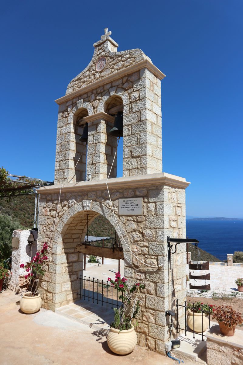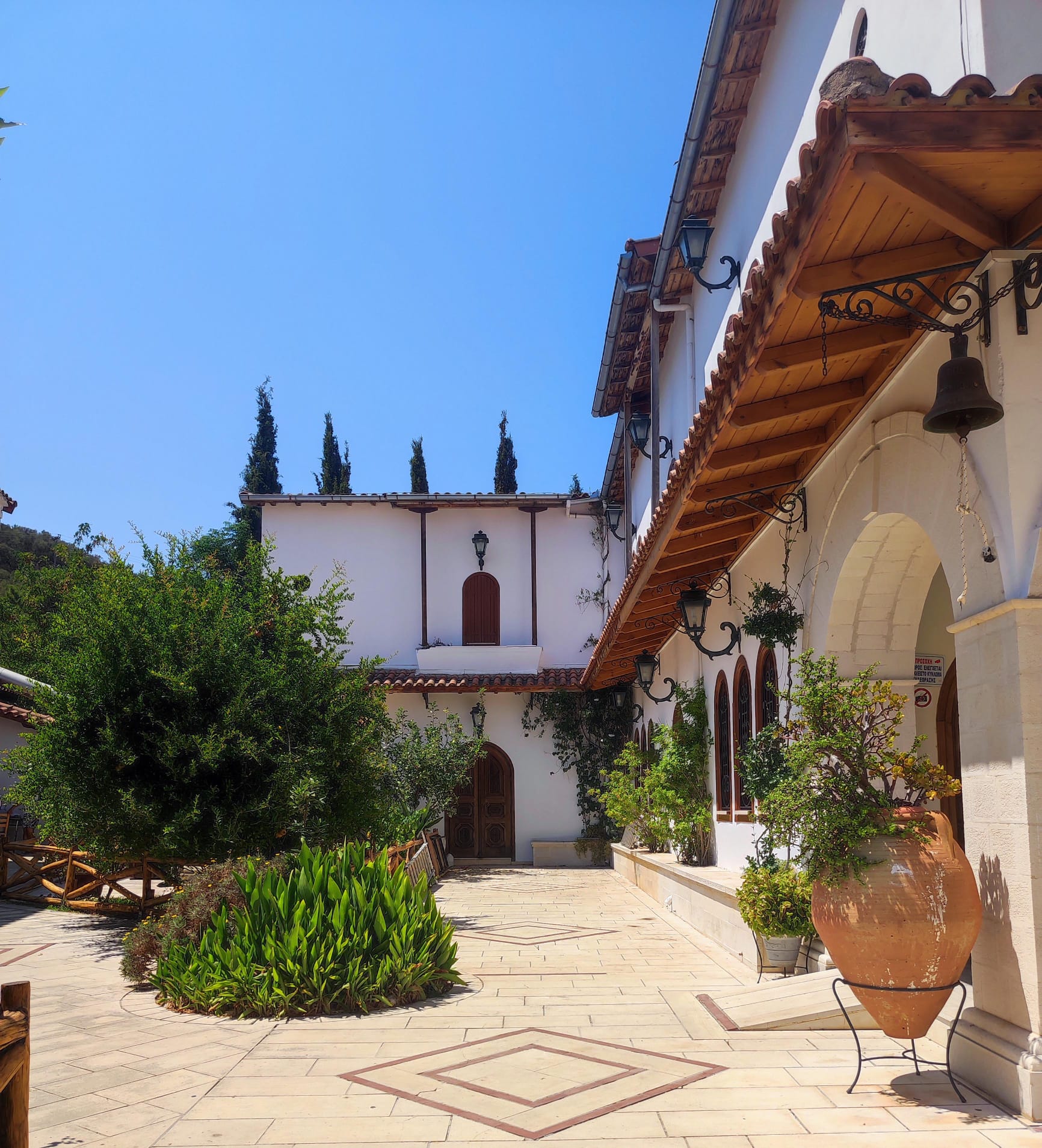 Lungo la strada che porta a Cape Lefkatas, che in questa zona percorre colline aride e arse dal sole, una deviazione conduce al monastero femminile di Agios Nikolaos Niras. Si tratta di un piccolo monastero ortodosso, articolato intorno alla piccola chiesa custodita da una monaca vecchia probabilmente quanto il monastero stesso. In mezzo a questa terra arida e brulla, l’apparizione di un piccolo agglomerato di vita, per quanto monastica, desta meraviglia e allarga il cuore. Il monastero rimane in altura, una piccola porta ad arco con una campanella è affacciata su una terrazza che dall’alto scruta il mare lontano. Una serie di vasi in ceramica appesi alle pareti portano messaggi e simboli cristiani: li trovo bellissimi, evocano l’antico e il sacro.