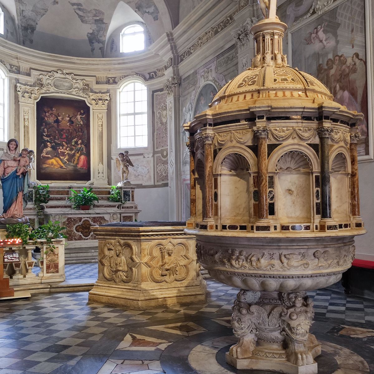 Separato fisicamente dal Duomo, nella via sottostante, si trova il Battistero. Si tratta di un oratorio, dunque di una piccola chiesa barocca, nella quale si trovano ben due fonti battesimali di cui uno, quello centrale, decisamente monumentale ed esuberante nell’impiego di marmi colorati. Tra l’altro, colpisce come un oggetto legato al culto cristiano sia decorato, sull’orlo esterno della vasca, con scene e animali mitologici e fantastici, che ben poco hanno a che fare con la liturgia cattolica.