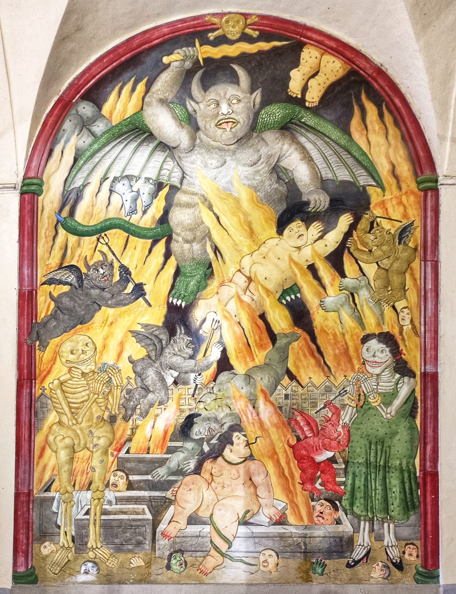 Sulle due pareti laterali, navata destra e navata sinistra, si trovano due affreschi realizzati da Fernando Botero. L’artista messicano, famoso per le sue opere popolate da personaggi pingui, sia in pittura che in scultura, in questa chiesa realizza la Porta dell’Inferno e la Porta del Paradiso. All’Inferno colpiscono le figure di morti: in particolare lo scheletro femminile, tutto truccato e agghindato, che ricorda molto le credenze sulla morte tipiche del Messico (se avete visto il cartone animato Disney Coco sapete di cosa sto parlando). Tra i cattivissimi che non potranno mai avere la redenzione si riconosce il ritratto di Hitler, inconfondibile coi suoi baffetti. Per il resto invidia, lussuria, avidità sono i peccati capitali che più di tutti sono messi alla gogna, tra diavoletti e un grande Satana con le ali che guarda altrove mentre brandisce una spada e tira fuori la lingua, come in tante raffigurazioni di Giudizio Universale medievali.