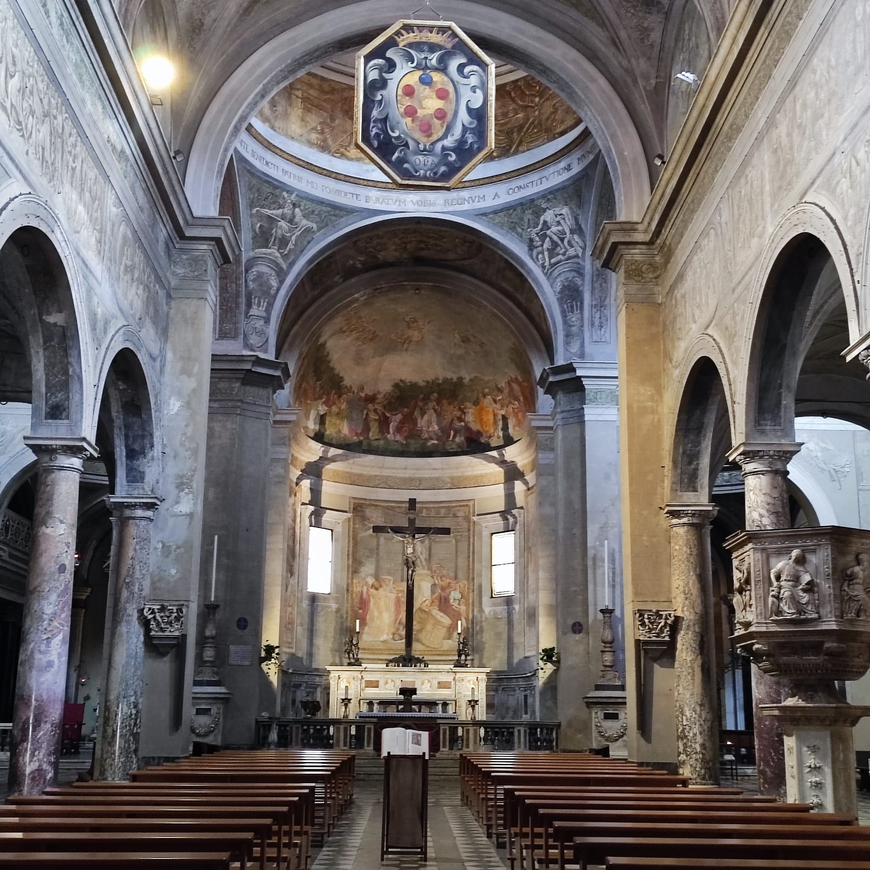 Sul lato monte della piazza del Duomo sorge una chiesa dalla facciata quadrata, sormontata da un piccolo frontoncino e animata da tre arcate cieche e da un loggiato di archetti gotici. Oggi è sconsacrata, ma un tempo ad essa era annesso il convento dei frati agostiniani, il cui chiostro, che al livello inferiore è illustrato con affreschi che raccontano episodi della vita di Sant’Agostino e della madre Santa Monica, al piano superiore ospita il Museo dei Bozzetti.