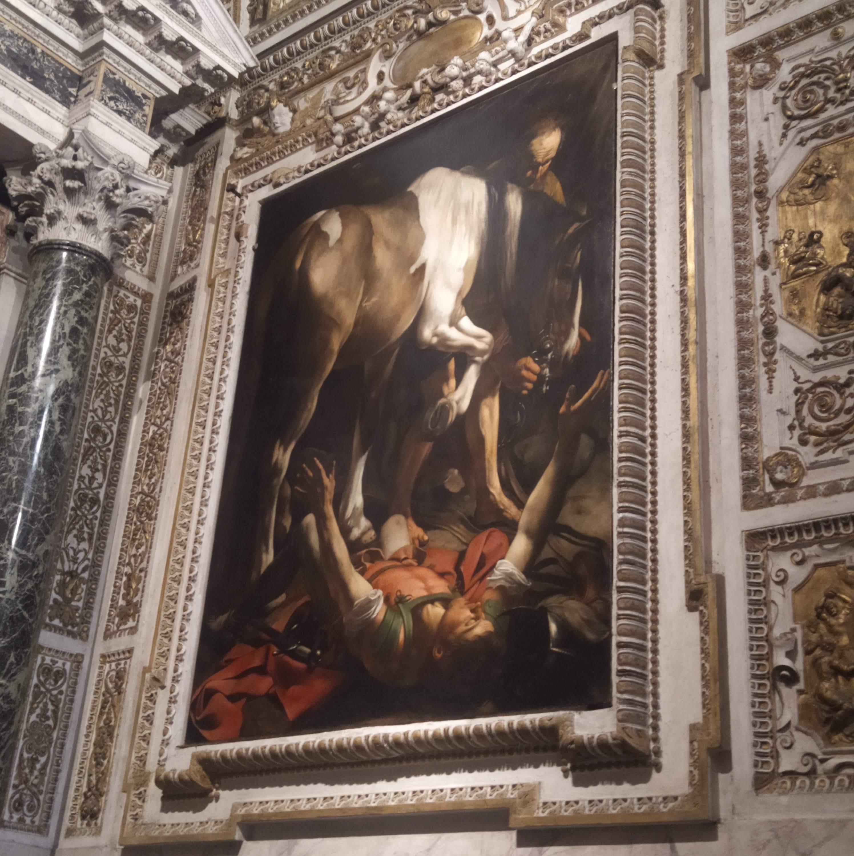 La Conversione di San Paolo è una scena di una potenza pazzesca: rappresenta il momento in cui il futuro apostolo, al sentire la voce di Dio che gli dice “Saulo, Saulo, perché mi perseguiti?” cade da cavallo e si converte. Il fascio di luce, che illumina il ventre del cavallo e soprattutto si irradia sul corpo sdraiato del santo, rappresenta simbolicamente la luce di Dio che illumina Paolo e prelude alla futura vita di apostolato, fino alla morte per martirio, di uno dei Padri della Chiesa. Il martirio di Paolo avviene a Roma, presso il luogo che è diventato poi l’Abbazia delle Tre Fontane: consiglio la visita, perché è un luogo veramente suggestivo e di pace, oltre che di grande bellezza.