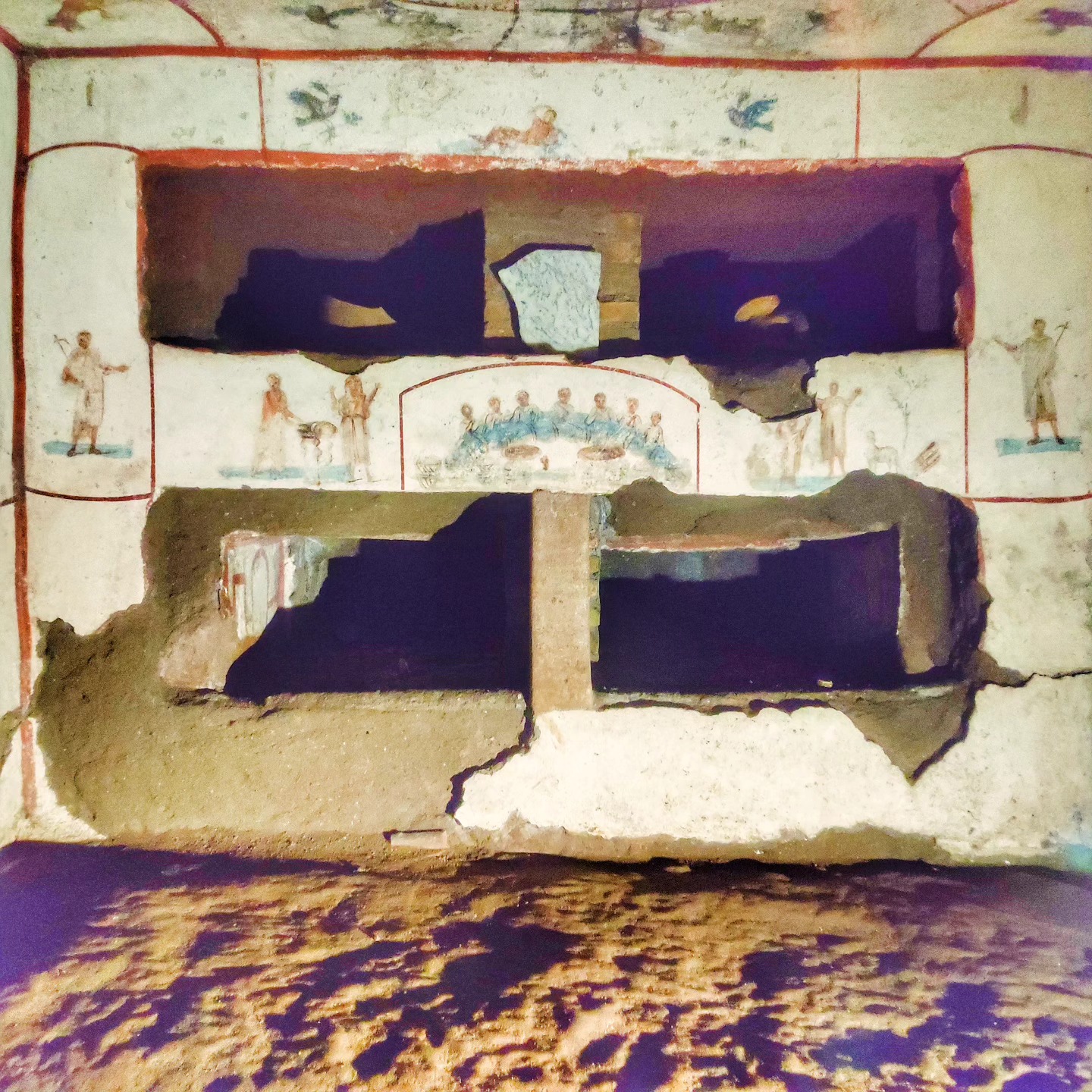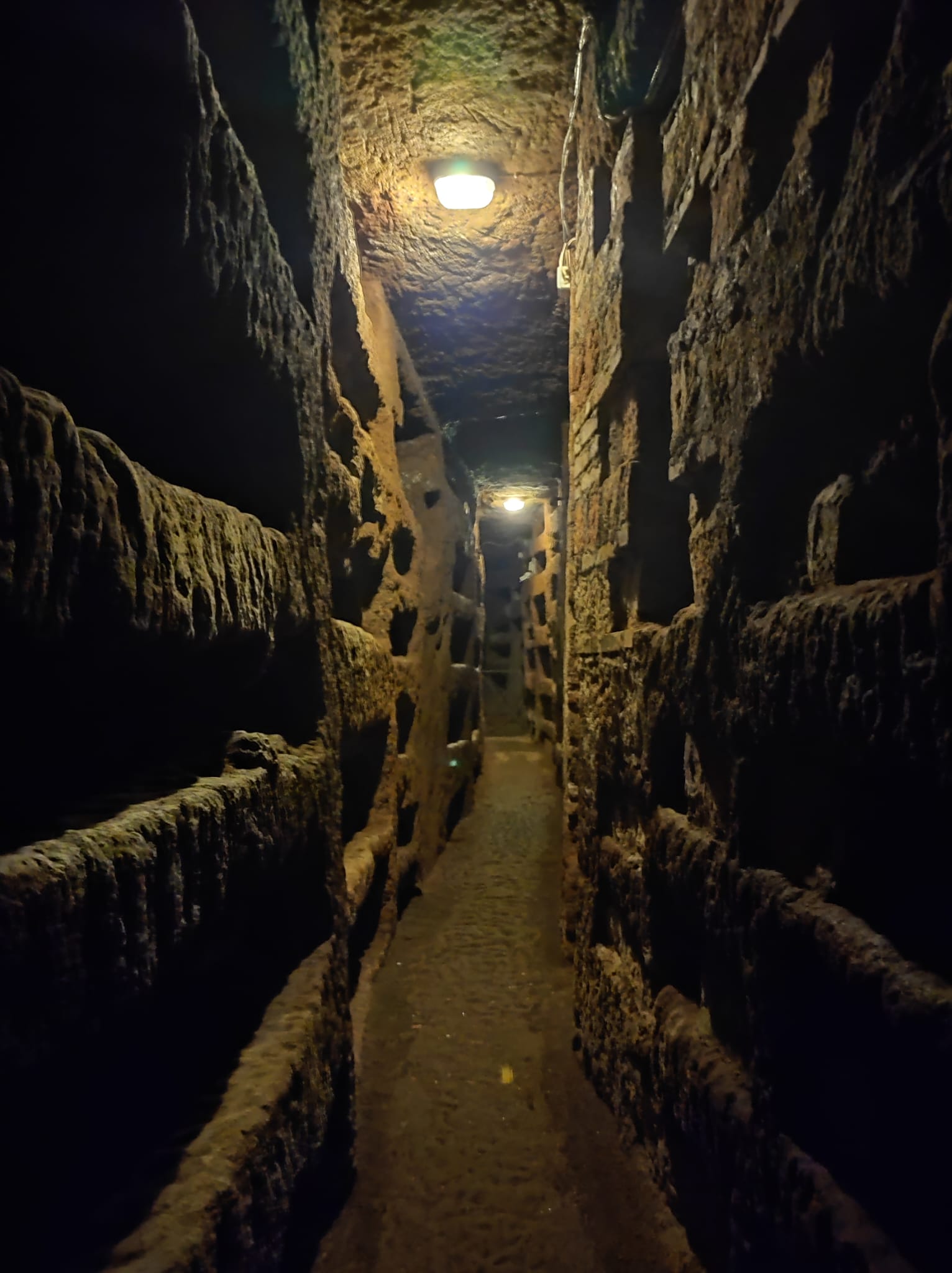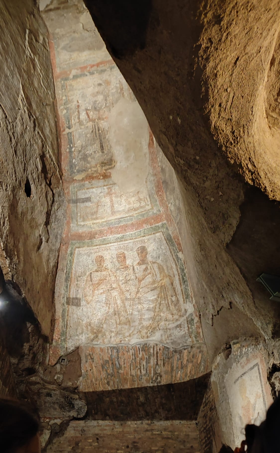 Il complesso, che occupa una superficie sotterranea complessiva di circa 15 ettari, è suddiviso in regiones, in quartieri. Il percorso di visita consueto, gestito dall’Istituto Salesiano di San Callisto interessa soltanto una di queste regioni, quella cosiddetta dei Papi e di Santa Cecilia. La visita, lo anticipo fin d’ora, non è esattamente una passeggiata di piacere: ogni mezz’ora gruppi di circa 15-20 persone distinti per lingua vengono accompagnati da una guida in una visita che è una corsa di 30 minuti all’interno dei cunicoli. Un’esperienza che purtroppo, mi duole dirlo, non rende giustizia della bellezza e dell’importanza del luogo. La sensazione è – per i visitatori – di essere trattati come polli in batteria. Un’occasione persa per valorizzare il nostro patrimonio archeologico e cristiano.