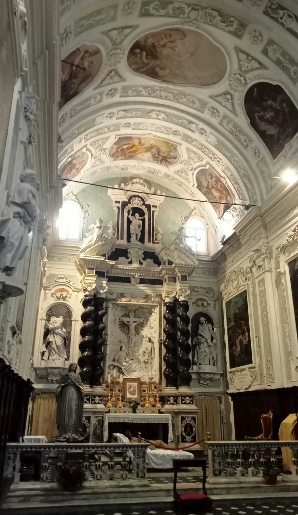 La volta a botte è affrescata e decorata con stucchi. L’impressione è di grande leggerezza e ariosità. Alle pareti agli stucchi si alternano dipinti che raffigurano santi. La parete di fondo è dominata dal bell’altare maggiore sopra il quale è scolpita a rilievo in marmo bianco una scena di crocifissione inquadrata da due colonne tortili nere per lato, che conferiscono eleganza e leggerezza. Davanti all’altare la statua di Cristo deposto dalla croce, sdraiato supino, in un’iconografia decisamente particolare.
