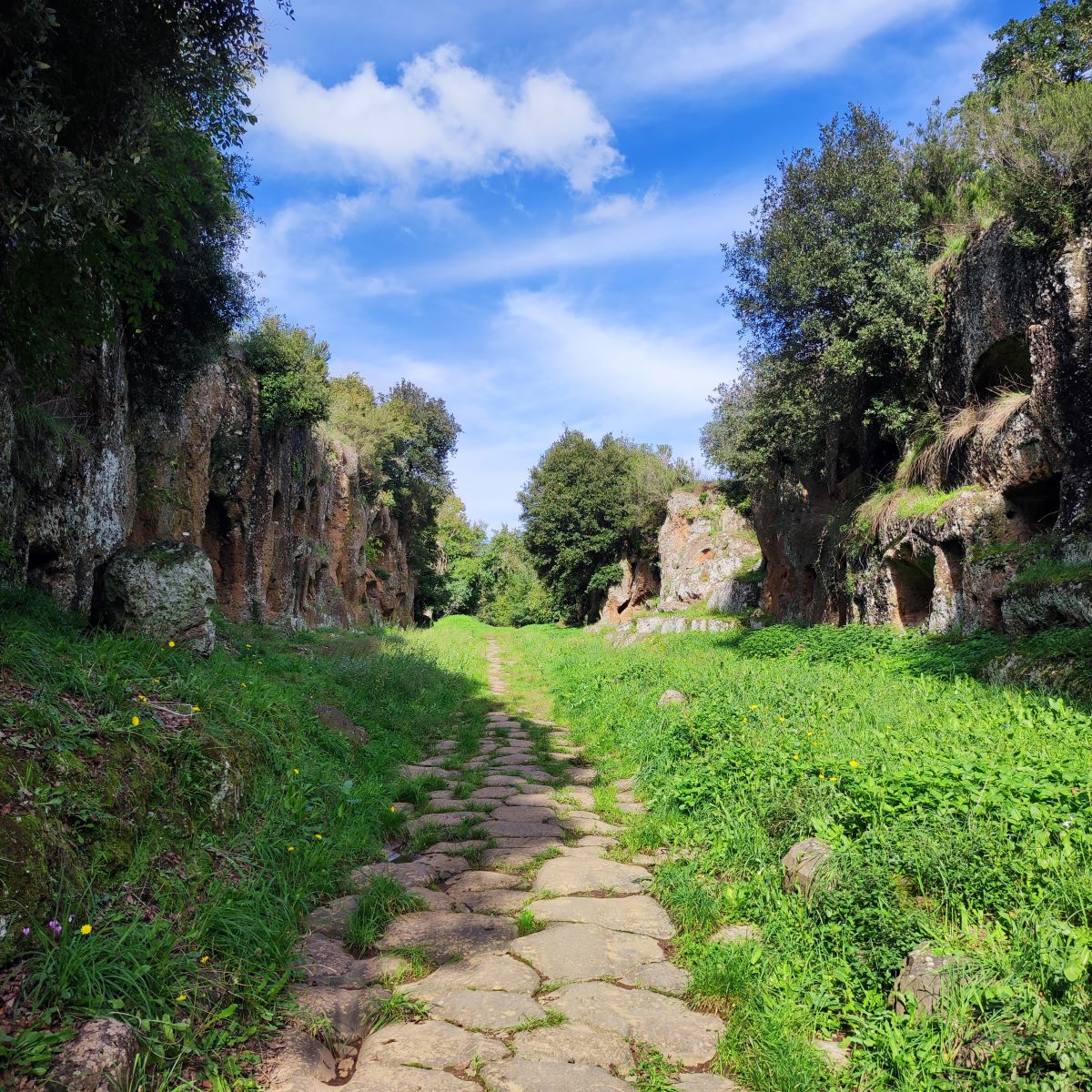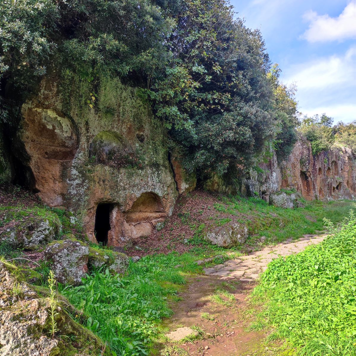 Dal punto di vista paesaggistico è un’esperienza veramente spettacolare: si cammina lungo una strada antica, ma ancora visibile eppure invasa dall’erba quel tanto che basta per renderla suggestiva, e da una parte e dall’altra siamo avvolti da pareti diritte di tufo nelle quali si aprono vere e proprie bocche, le porte delle camere funerarie.