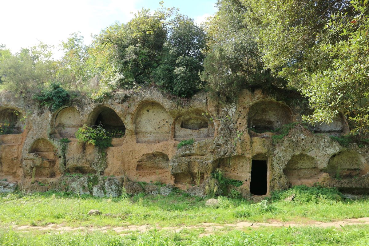 Si distinguono poi due veri e propri colombari a cielo aperto, cioè camere funerarie nelle quali si aprono tante piccole nicchie che ospitavano altrettante olle con le ceneri dei defunti. E poi ci sono le tombe a camera scavate nella tagliata tufacea: una è su due livelli, una a livello della strada e l’altra al primo piano, altre rivelano una certa articolazione delle camere all’interno.