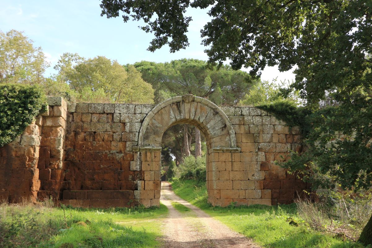 La visita alla città romana di Falerii Novi si svolge a partire dalla Porta di Giove, un’imponente porta ad arco ricavata nelle mura e prospiciente la via provinciale che conduce al moderno insediamento di Parco Falisco, nel comune di Fabrica di Roma. L’arco della Porta di Giove è considerato uno dei più antichi esempi di impiego dell’arco etrusco: e siamo alla metà del III secolo a.C. La porta deve il nome alla testa maschile che sormonta l’arco, interpretata quale ritratto di Giove. Le mura sono davvero imponenti e dimostrano, con il loro essere ancora in piedi dopo 2250 anni, quanto l’opera quadrata fosse una tecnica muraria estremamente resistente.