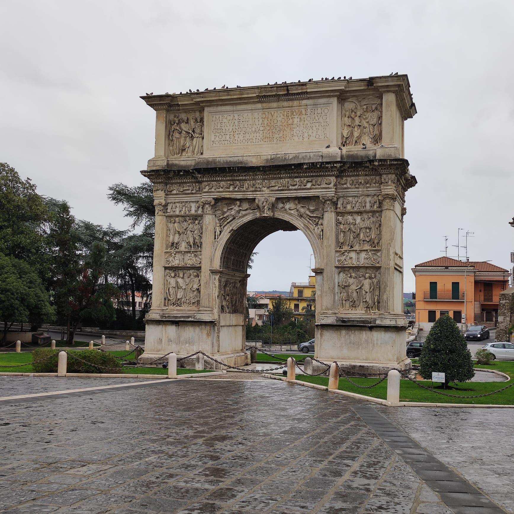 L’Arco, che oggi appare al centro di una piazza, da una parte percorsa dalle automobili, dall’altra pedonale, fu costruito negli ultimi anni del regno di Traiano, tra il 114 e il 117 d.C., ed è ricchissimo di decorazioni scultoree che celebrano l’imperatore come comandante militare e politico, come generale vittorioso, ma anche e soprattutto come Optimus Princeps: in uno dei rilievi interni al fornice è infatti riportata la scena dell’istituzione degli alimenta, cioè un provvedimento preso dall’imperatore che con fondi propri assicurava sostentamento ai bambini bisognosi. Per saperne di più ti invito a sfogliare su instagram lo slideshow che dedica all’argomento @iusintempore.