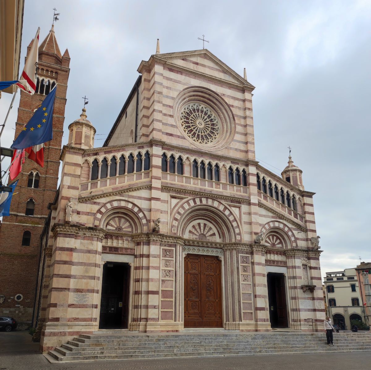 Via Carducci sfocia in Piazza Dante, una bella piazza porticata su due lati, sulla quale affaccia la Cattedrale di San Lorenzo e Palazzo Aldobrandeschi, costruito all’inizio del Novecento, dopo la demolizione del precedente Palazzo Pretorio, in stile neogotico. La Cattedrale che risale all’inizio del XIV secolo, è stata anch’essa molto ricostruita nel corso dei secoli. La sua facciata, nell’alternarsi di filari di pietra bianca e di pietra rosa, regala un bell’effetto cromatico. La viuzza che separa la cattedrale da Palazzo Aldobrandeschi ospita una serie di ristorantini e osterie: se siete fortunati (il locale è molto piccolo), consiglio una sosta a “Al numero Nove“: cucina tradizionale in un ambiente estremamente familiare e accogliente e a prezzi incredibilmente contenuti.
