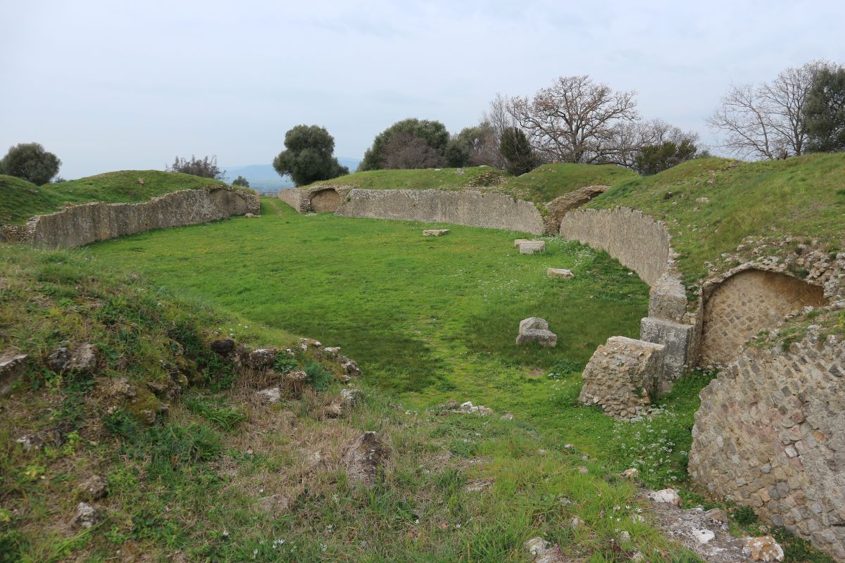 L’anfiteatro è di età romana, si installa sulla sommità di uno dei due poggi, andando a farsi strada tra gli edifici etruschi di età ellenistica precedenti. Non è particolarmente grande e di esso si conserva soltanto l’arena e il primo livello della cavea, che doveva sviluppare però in altezza. Certo, doveva essere magnifico vederlo dal basso del vallone ergersi in tutta la sua maestosità: un po’ come – se avete visto il film “Il Gladiatore II” – è stato erroneamente ricostruito il Colosseo, in cima a una collina che domina il territorio circostante. Per il Colosseo non c’è niente di più sbagliato. Ma l’anfiteatro di Roselle invece stava proprio in quella posizione scenografica e dominante.