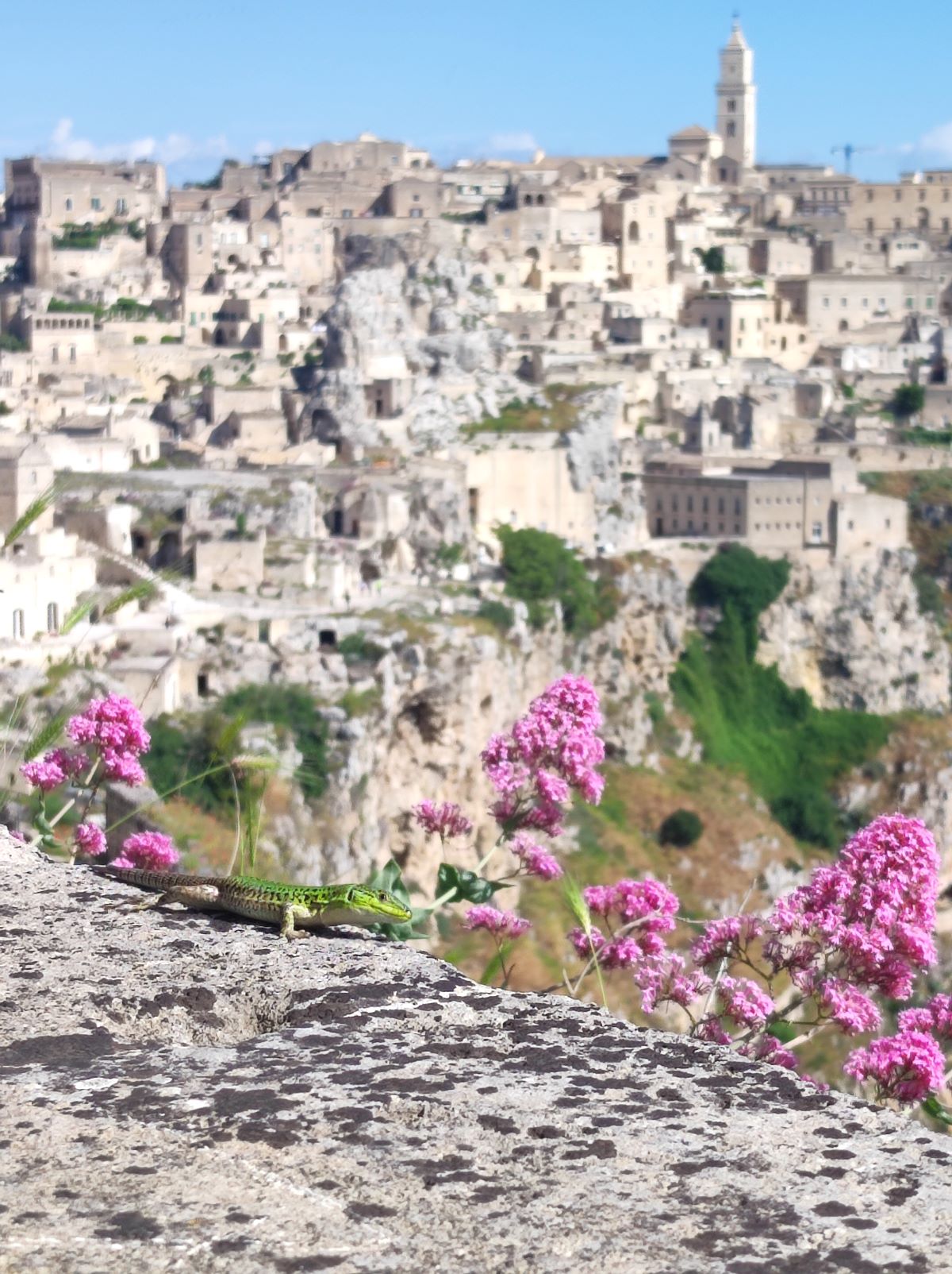 I Sassi sono i due quartieri, chiamati Sasso Caveoso e Sasso Barisano, separati dalla Civita, sulla quale sorge la Cattedrale. Al di sotto è la Gravina, selvaggia, stretta e profonda. Domina il colore ocra giallo dei Sassi, il verde spento della Gravina nella quale però in questa stagione si accende la fioritura gialla della ginestra. E i Sassi stessi si colorano, puntualmente, del rosso dei papaveri e del fucsia della valeriana in fiore. La vista – che sia panoramica o di dettaglio – è quanto di più poetico e suggestivo si possa immaginare.