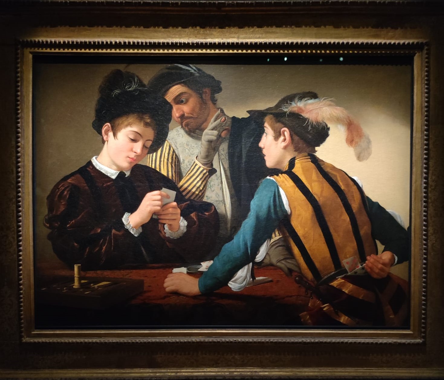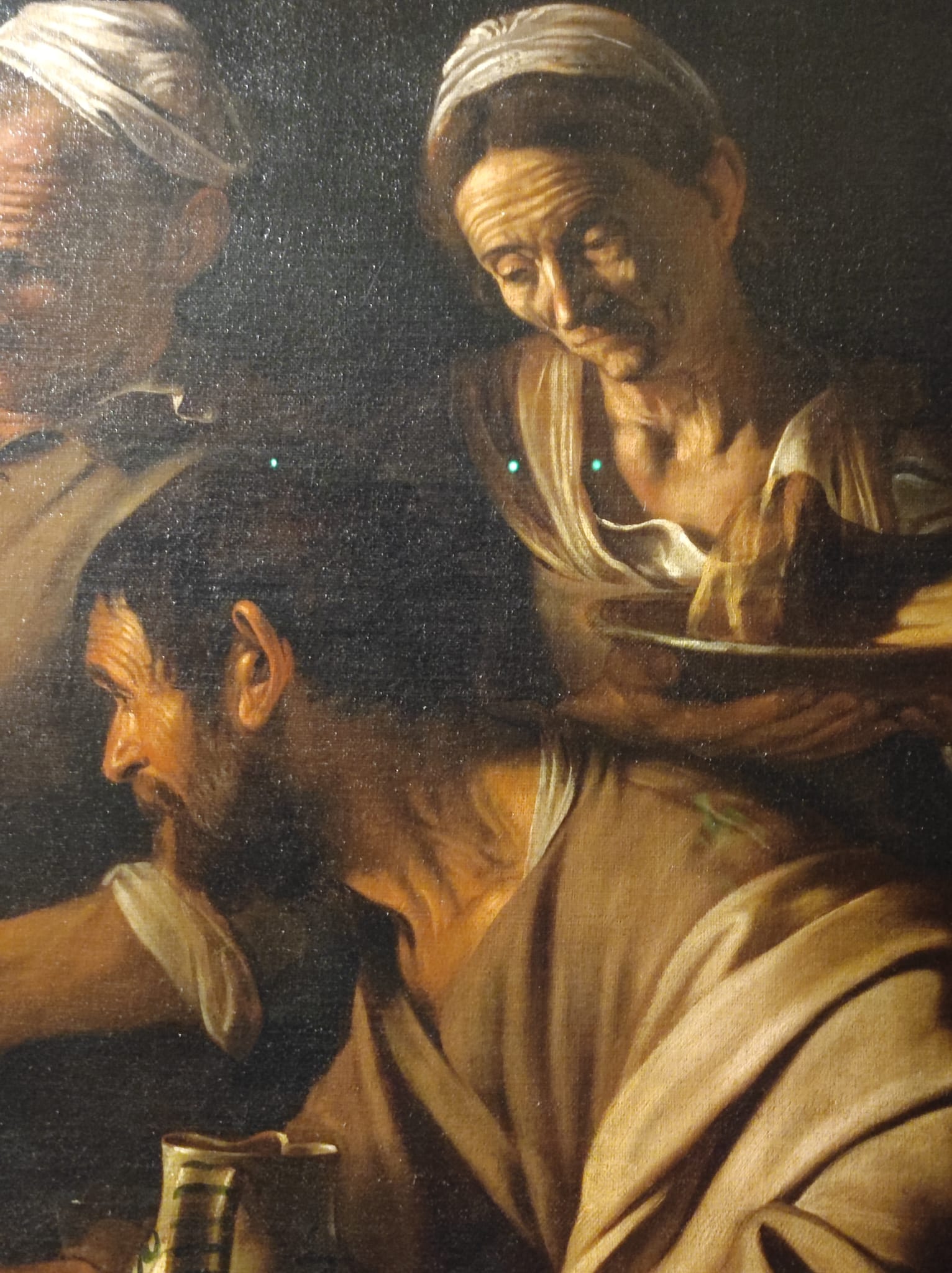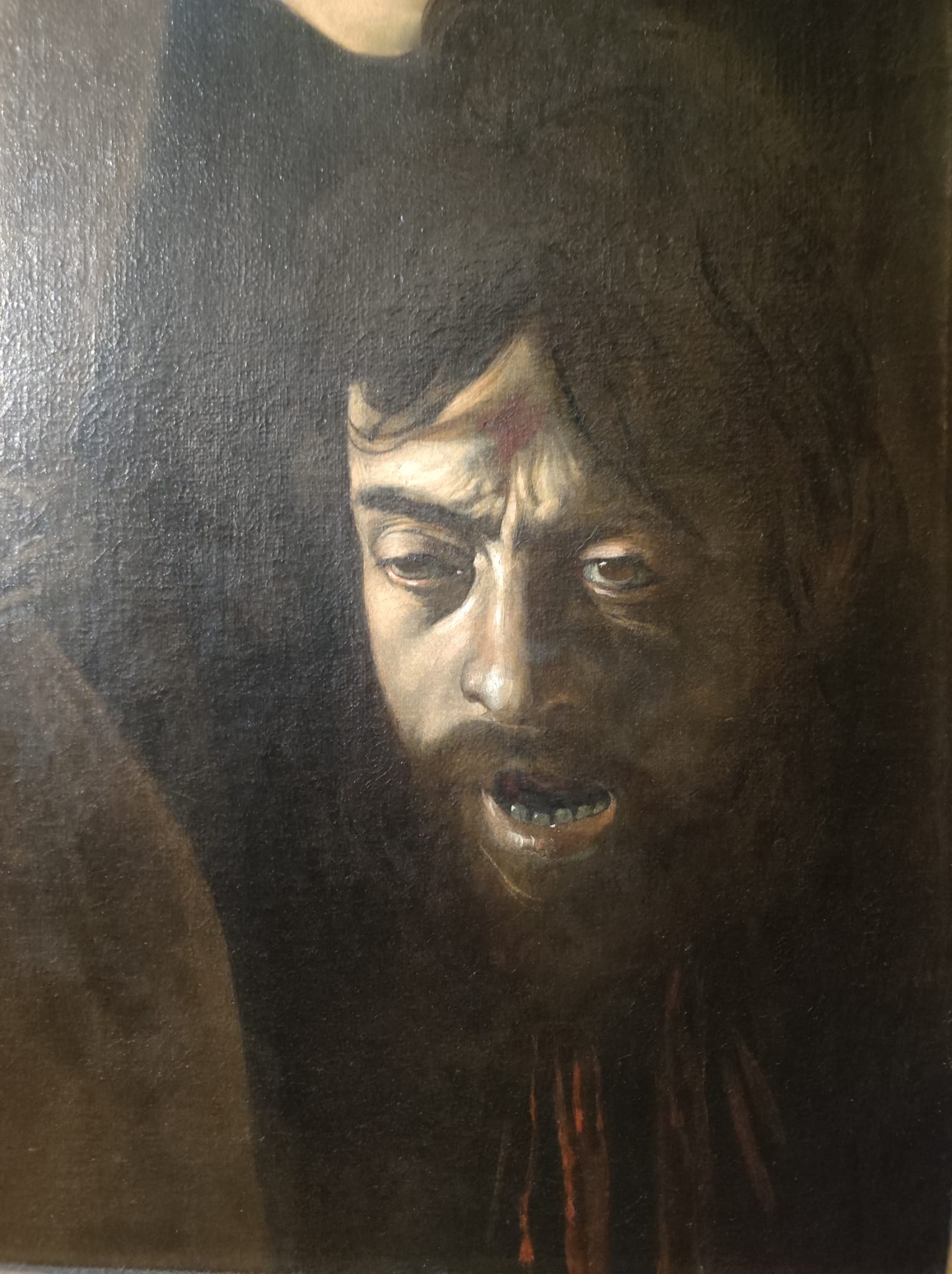 Non vi racconterò qui tutte le opere, ma solo alcune, quelle che mi hanno colpito per la loro storia o per qualche dettaglio. In particolare questa visita è stata per me – che più volte ho incontrato delle opere di Caravaggio, alcune delle quali in mostra, nelle mie visite ai musei – l’occasione per soffermarmi su dettagli altre volte magari poco presi in considerazione, o per riconoscere dei tratti distintivi della poetica figurativa dell’artista.